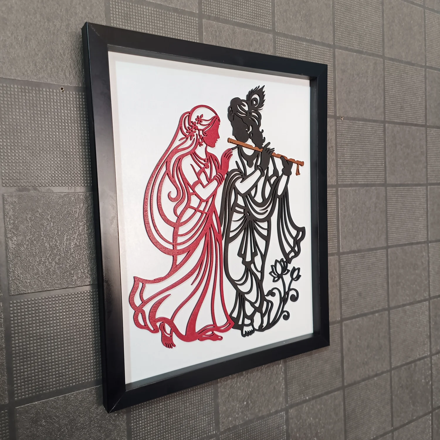 Designed with a sophisticated 3D layered effect, the frame features intricate artwork of Lord Krishna playing the flute beside Radha, enclosed in a sleek black premium frame. Perfect for adding a spiritual and artistic touch to your interiors.
