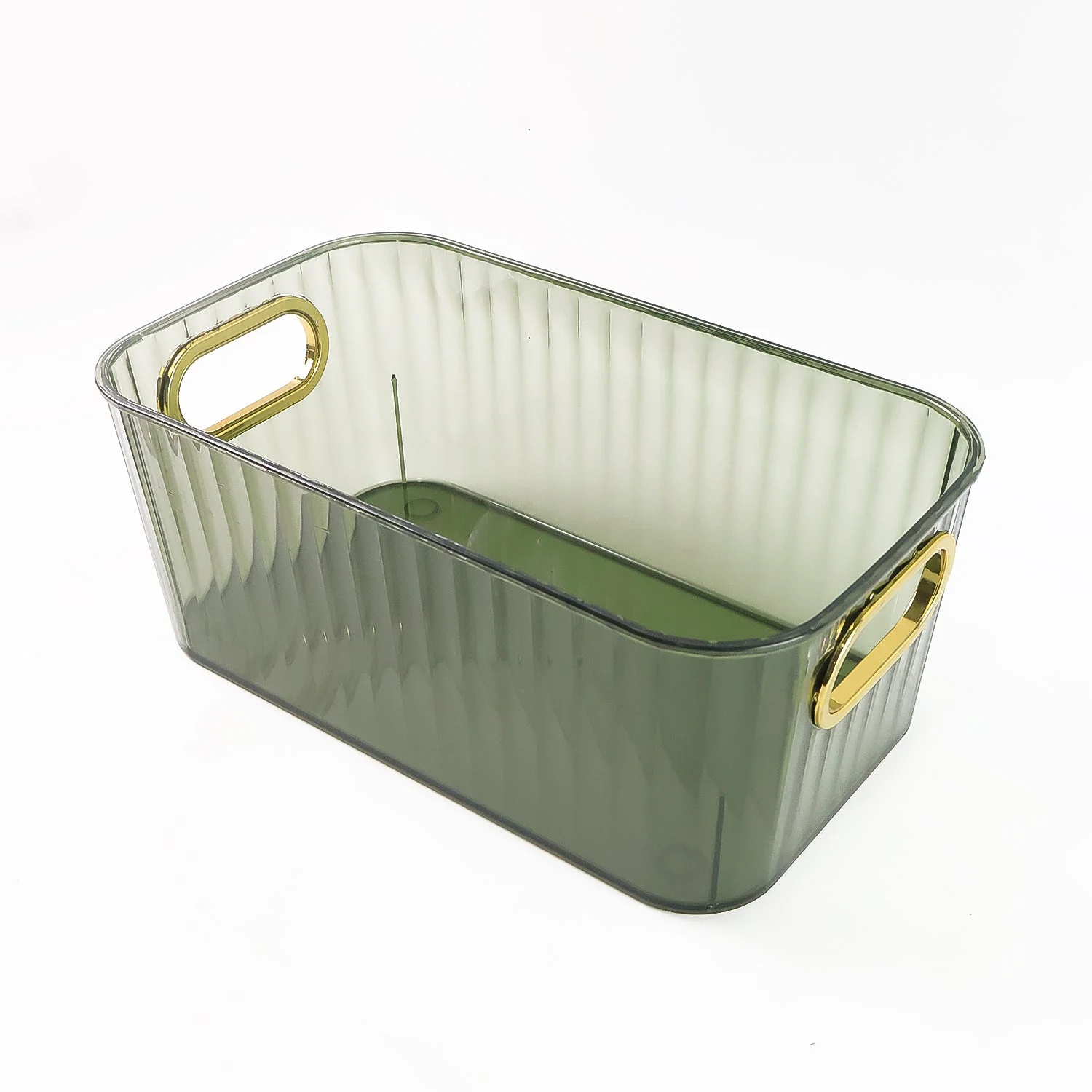 Organize your space with style using this elegant ribbed transparent storage basket. Designed with a sophisticated translucent body and luxurious gold-tone handles, this multipurpose organizer adds both functionality and visual appeal to your kitchen, bathroom, office, or vanity. Whether used to store spice jars, toiletries, makeup, or stationery, this modern basket brings structure and charm to any cluttered surface.