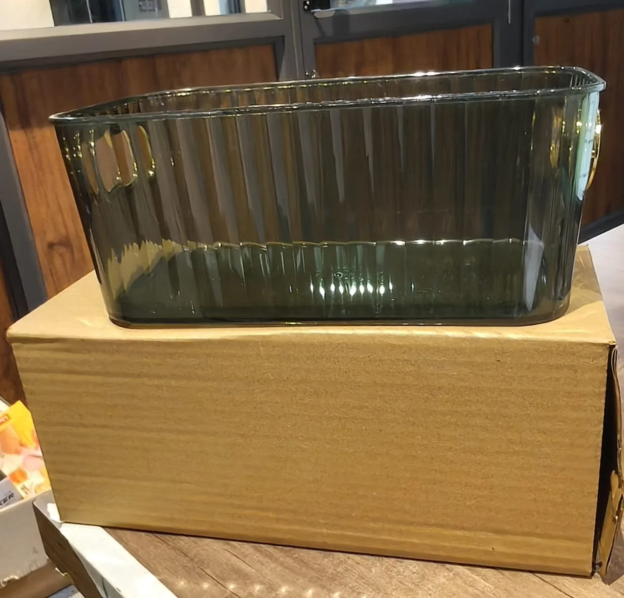 Design: Rectangular with ribbed transparent sides and metallic side handles