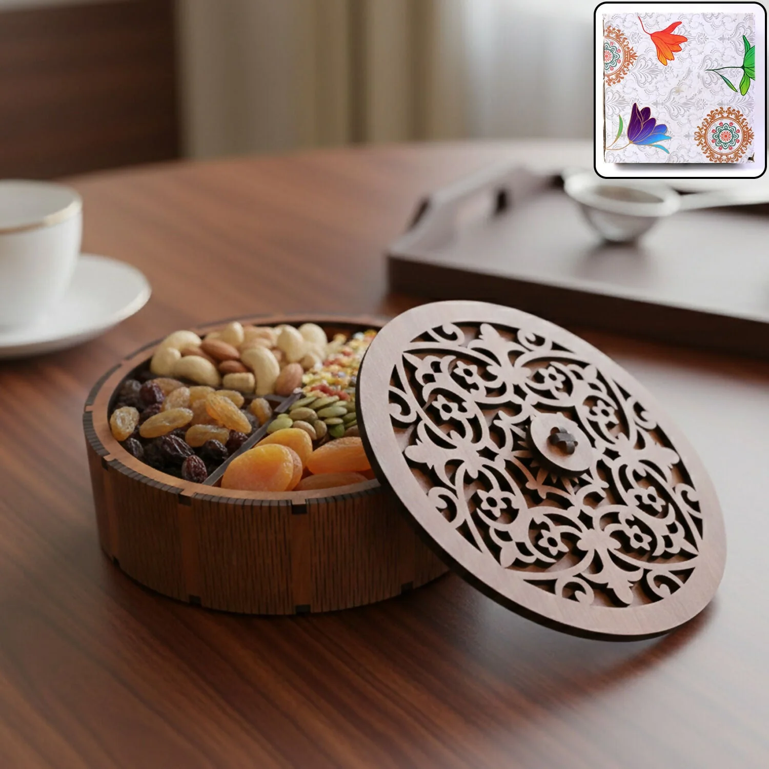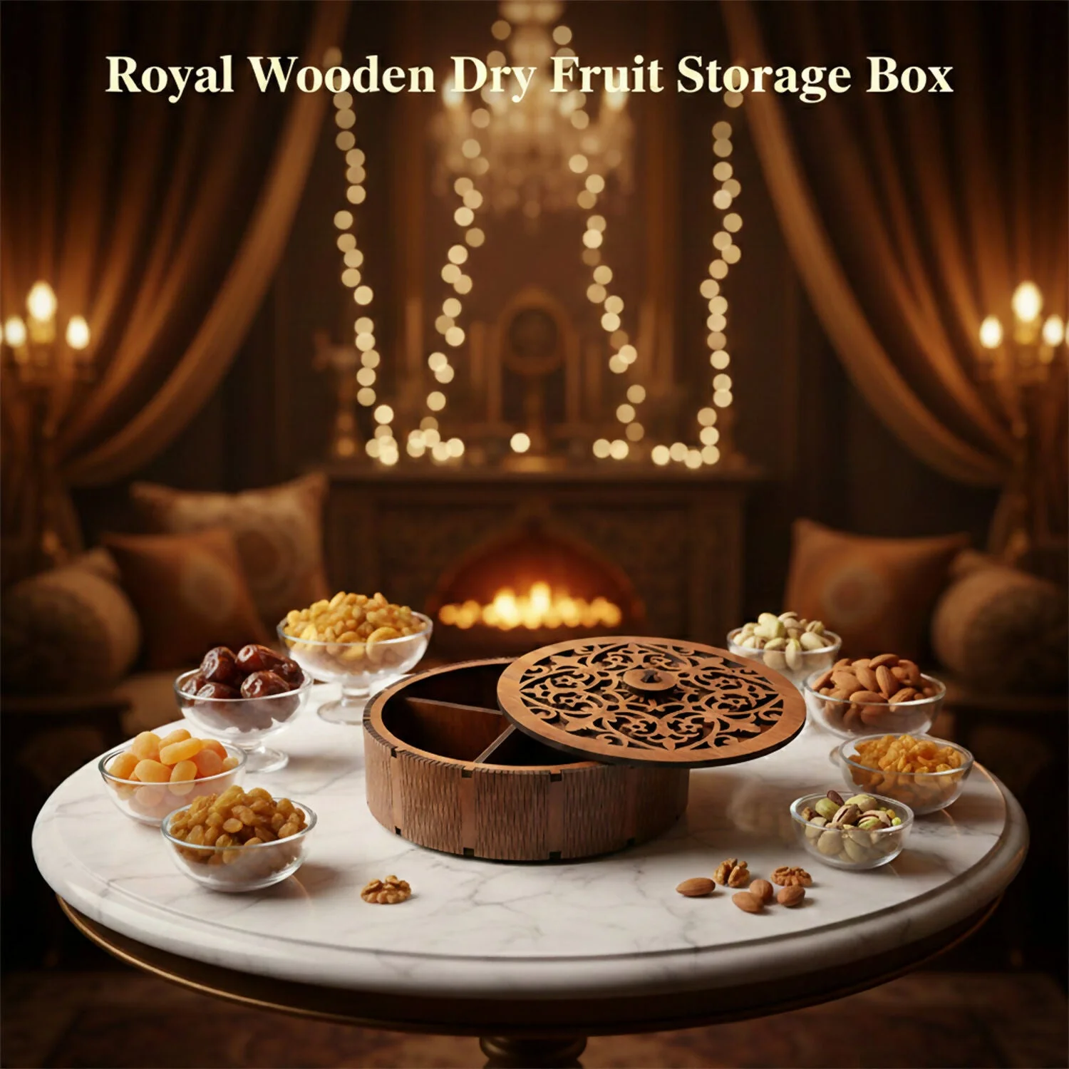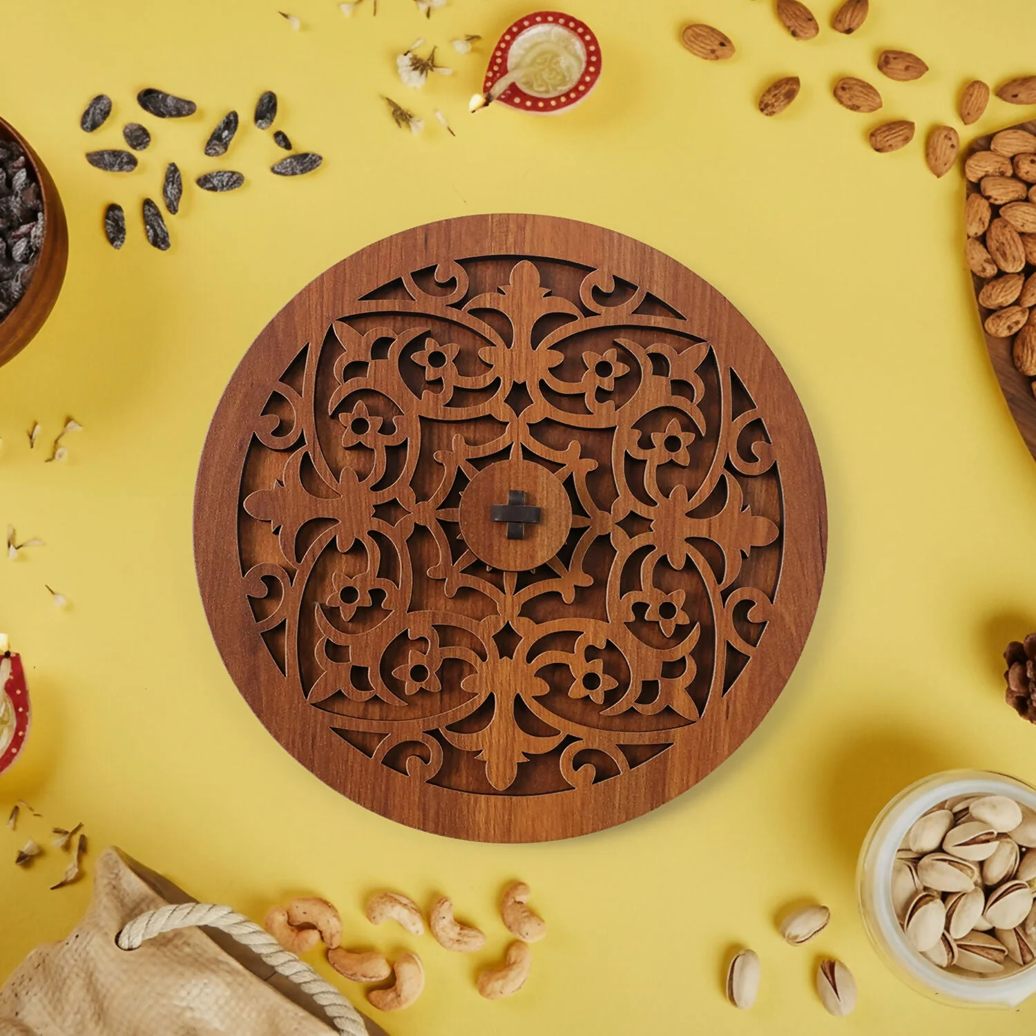 Enhance your serving and gifting experience with this premium round decorative dry fruit storage box featuring an intricately carved lid. Designed to add a touch of elegance to your table, this box is ideal for serving dry fruits, mukhwas, nuts, sweets, or festive treats in an organized and presentable way.