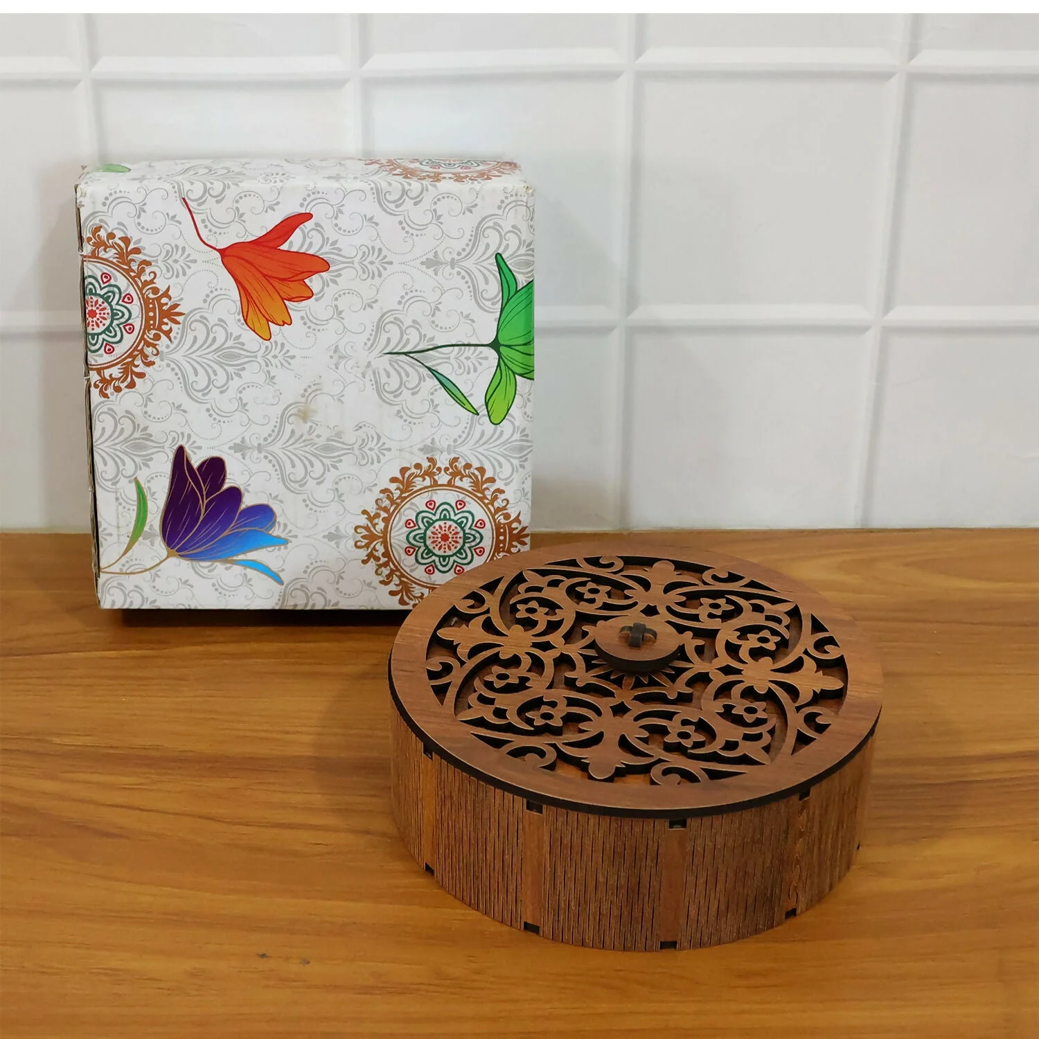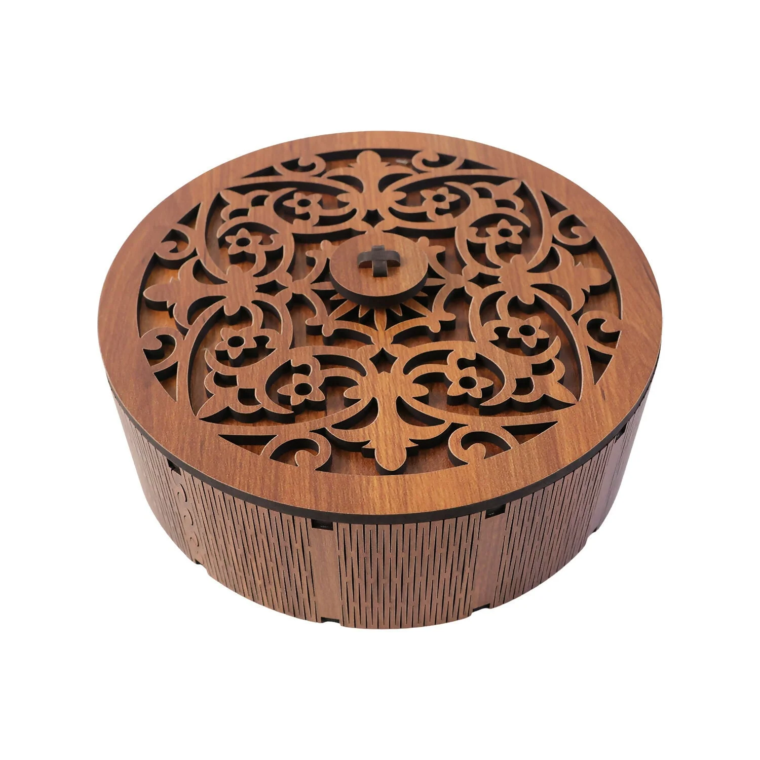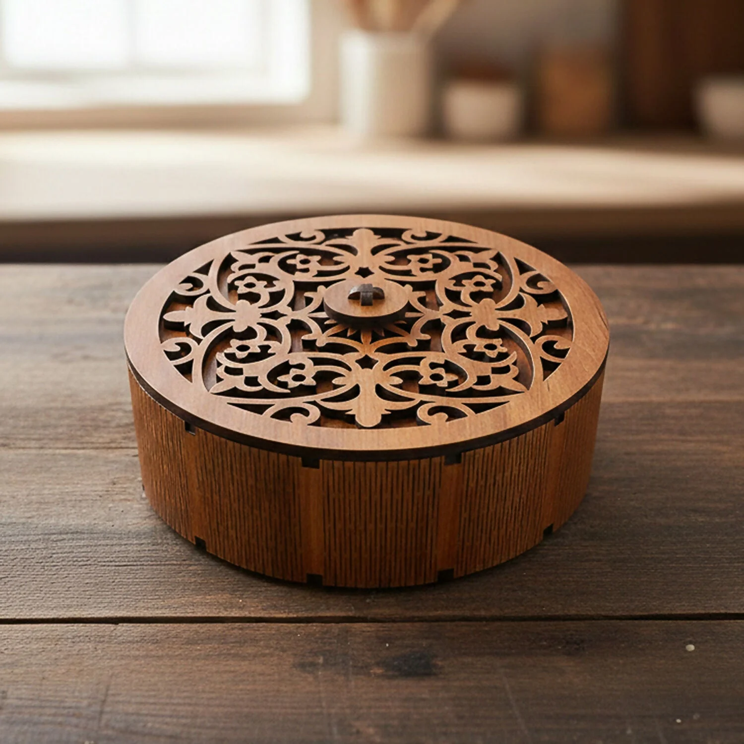 The round shape gives it a unique and luxurious appeal, while the internal compartments help keep different items neatly separated. Perfect for festivals, celebrations, weddings, return gifts, or everyday table décor, this storage box blends traditional aesthetics with practical functionality.