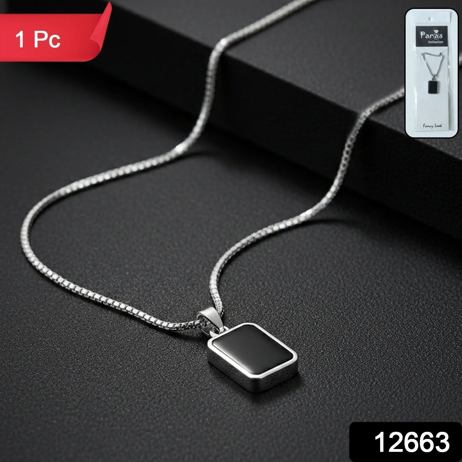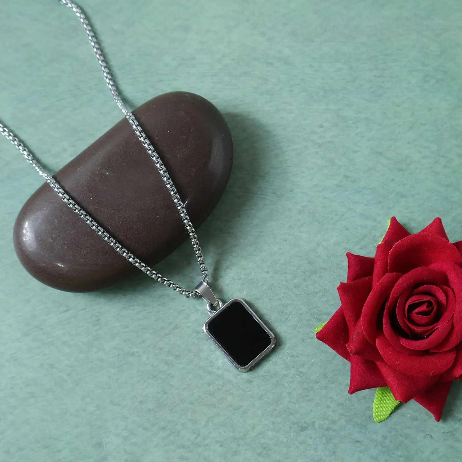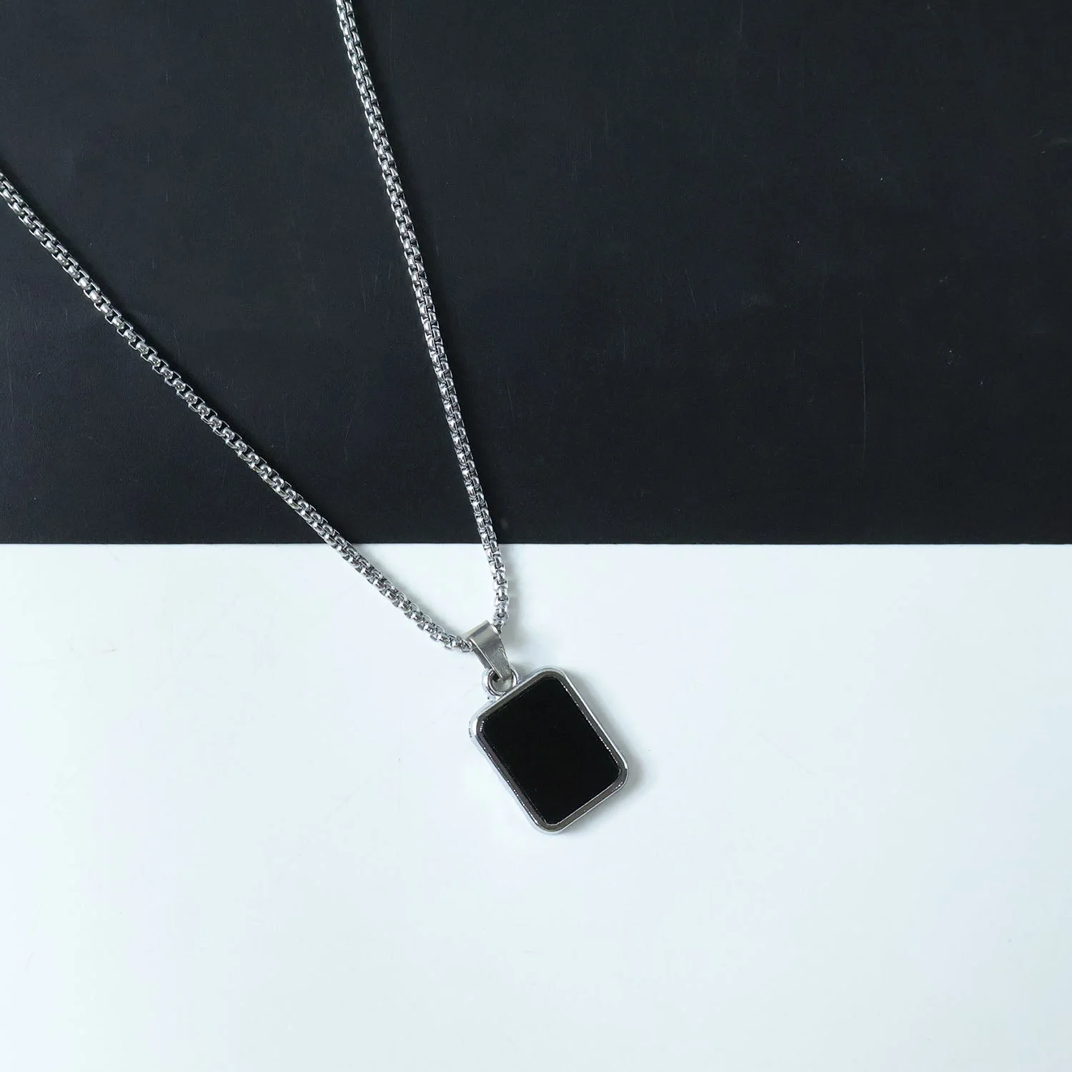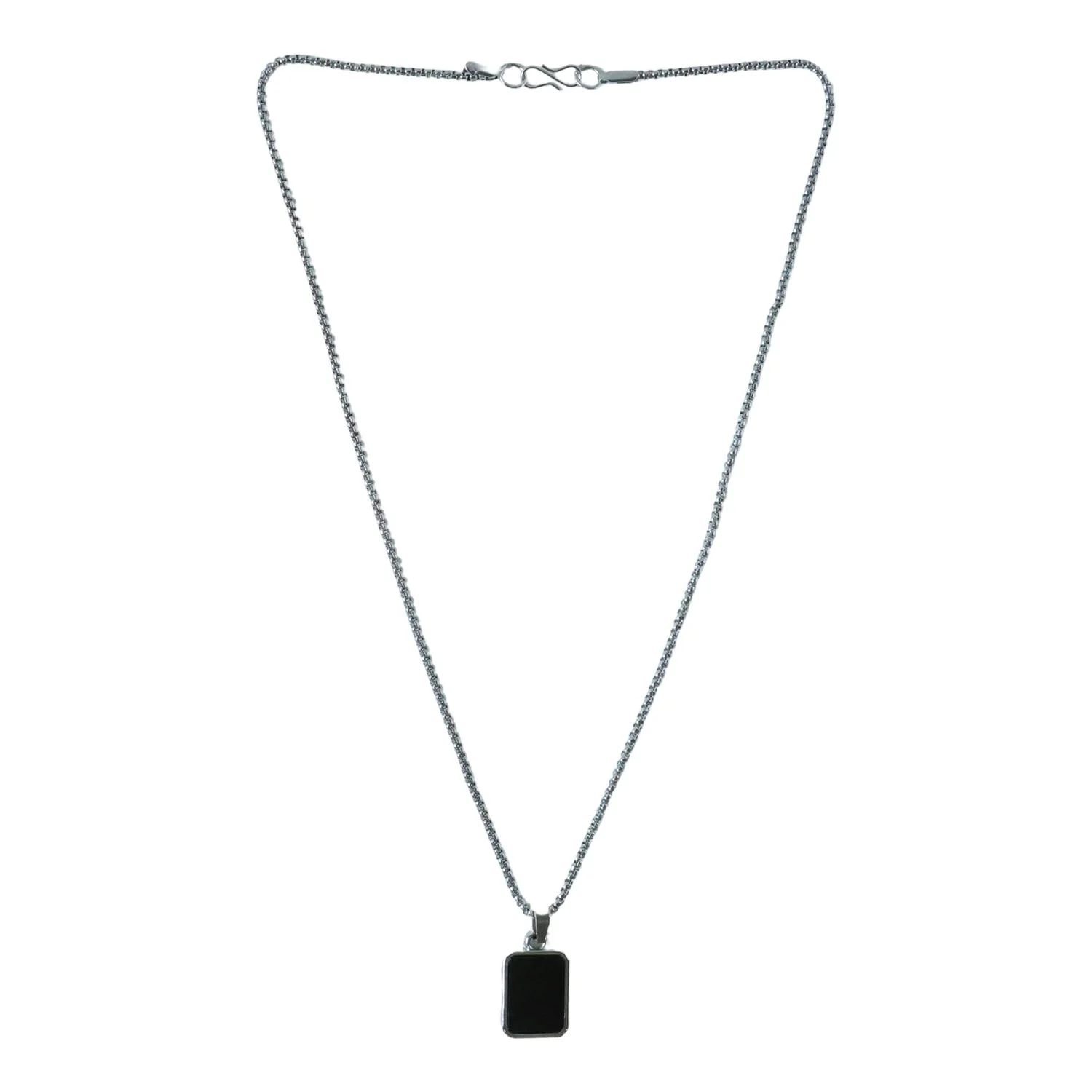 Premium Stainless-Steel Men’s Fashion Pendant Chain with Sleek Black Rectangle Pendant – Heavy-Duty Modern Box Chain for Daily Wear, Party Styling, Gifting & Casual Outfits – Trendy Imitation Jewellery for Boys & Men (1 Pc)