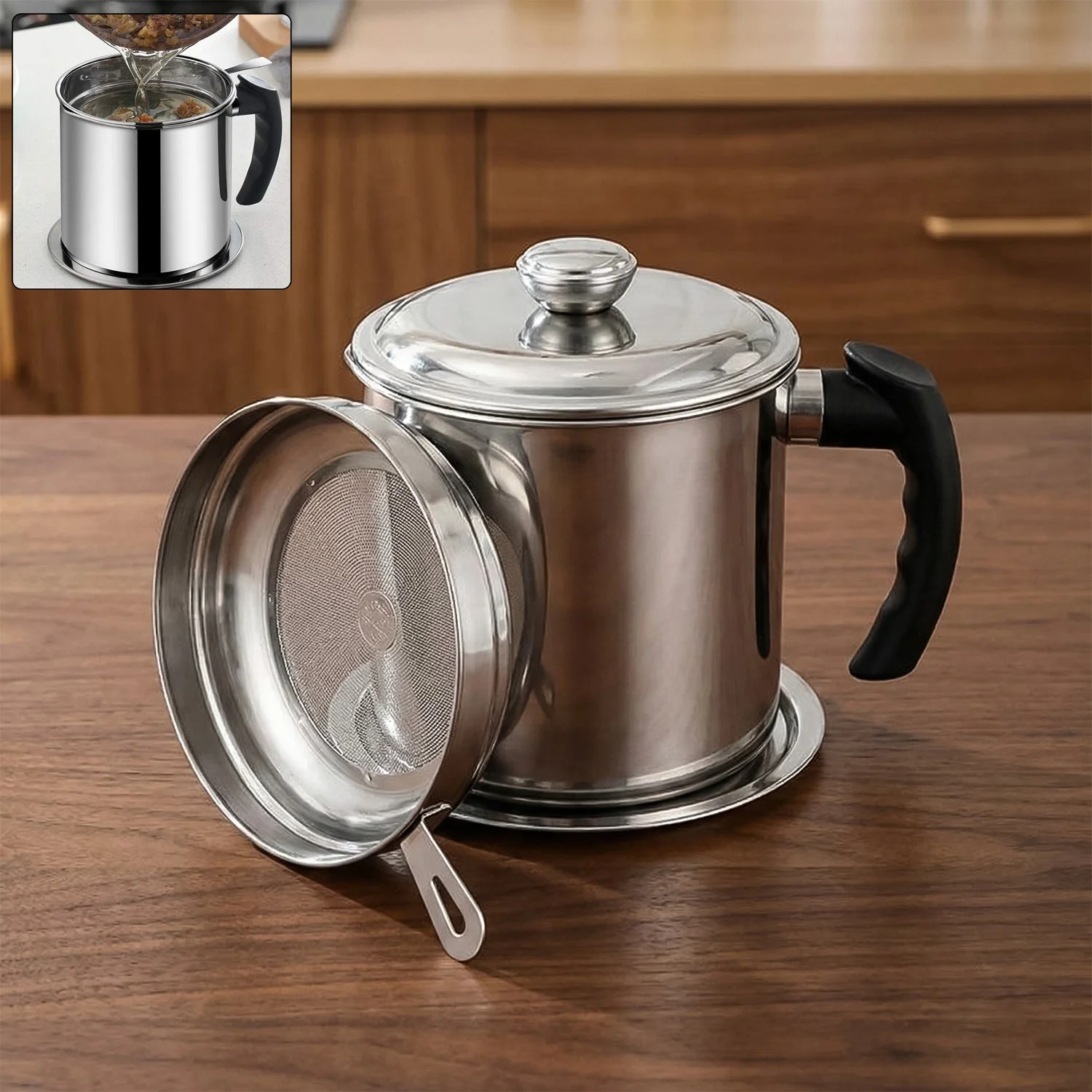 The pot comes with a high-grade stainless steel body, a heat-resistant handle, and a fine mesh strainer that efficiently filters out food crumbs, spices, impurities, and residues from used cooking oil. The included airtight lid protects oil from dust and moisture while the anti-slip base plate prevents countertop scratches and provides stability.