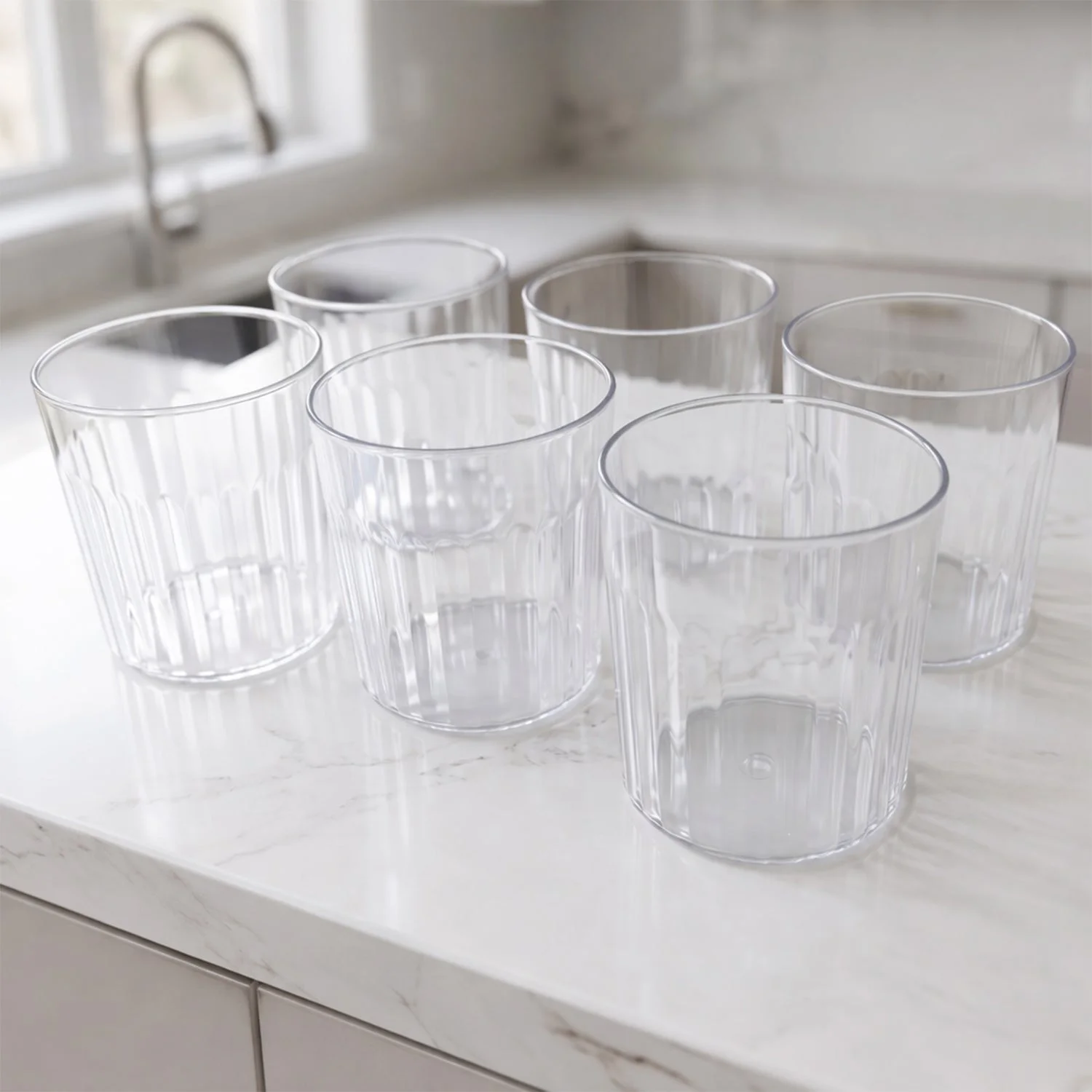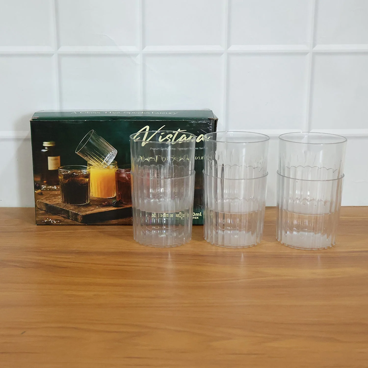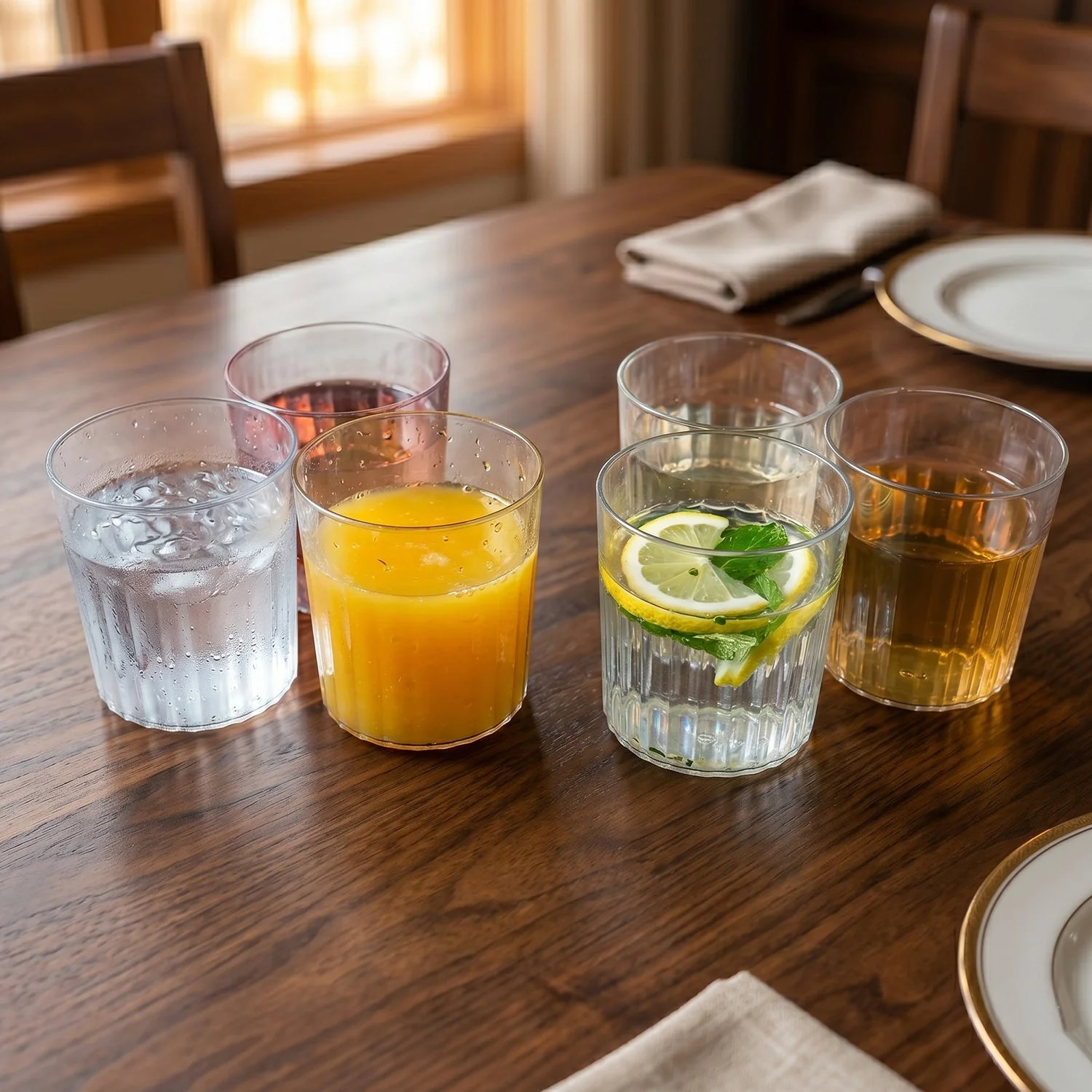 Serving drinks in mismatched glasses can affect presentation during meals or gatherings. The Premium Transparent Drinking Glass Set offers a stylish transparent drinking glass set designed for everyday dining. This 300ml water glass set works perfectly as a plastic beverage glass set for juice, water, and soft drinks.
