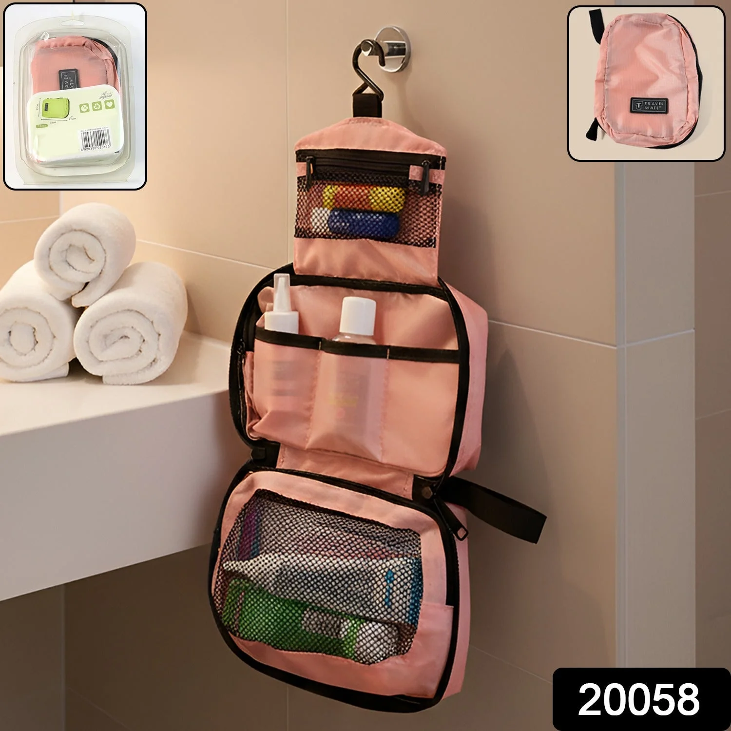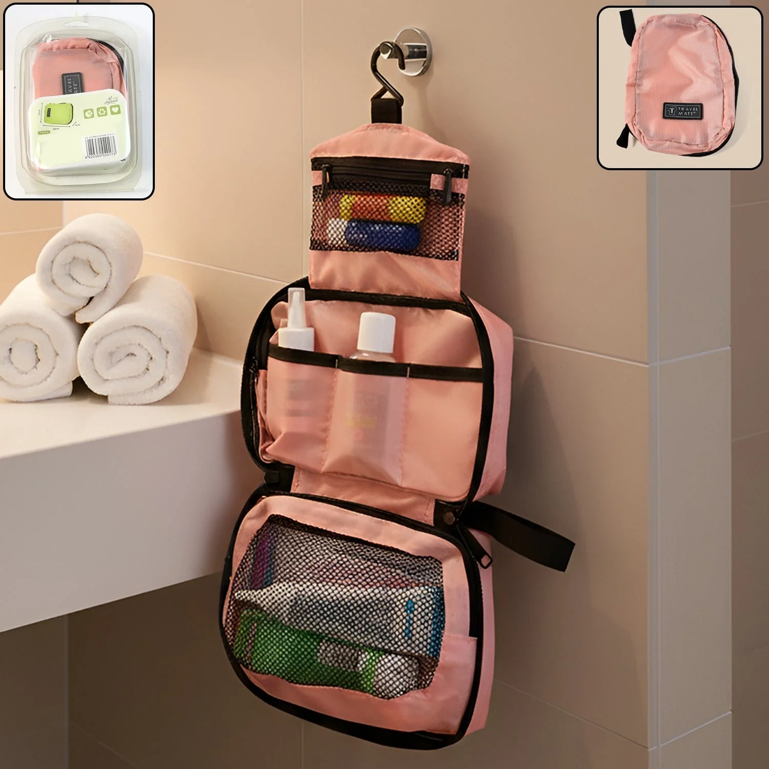 The bag features multiple spacious compartments, transparent pockets, and zippered sections, allowing you to store skincare products, makeup, grooming accessories, shaving kits, medicines, and more. Its foldable and compact design makes it perfect for travel, while the strong hanging hook allows you to hang it in bathrooms, wardrobes, hotel rooms, or dressing areas for convenient access.