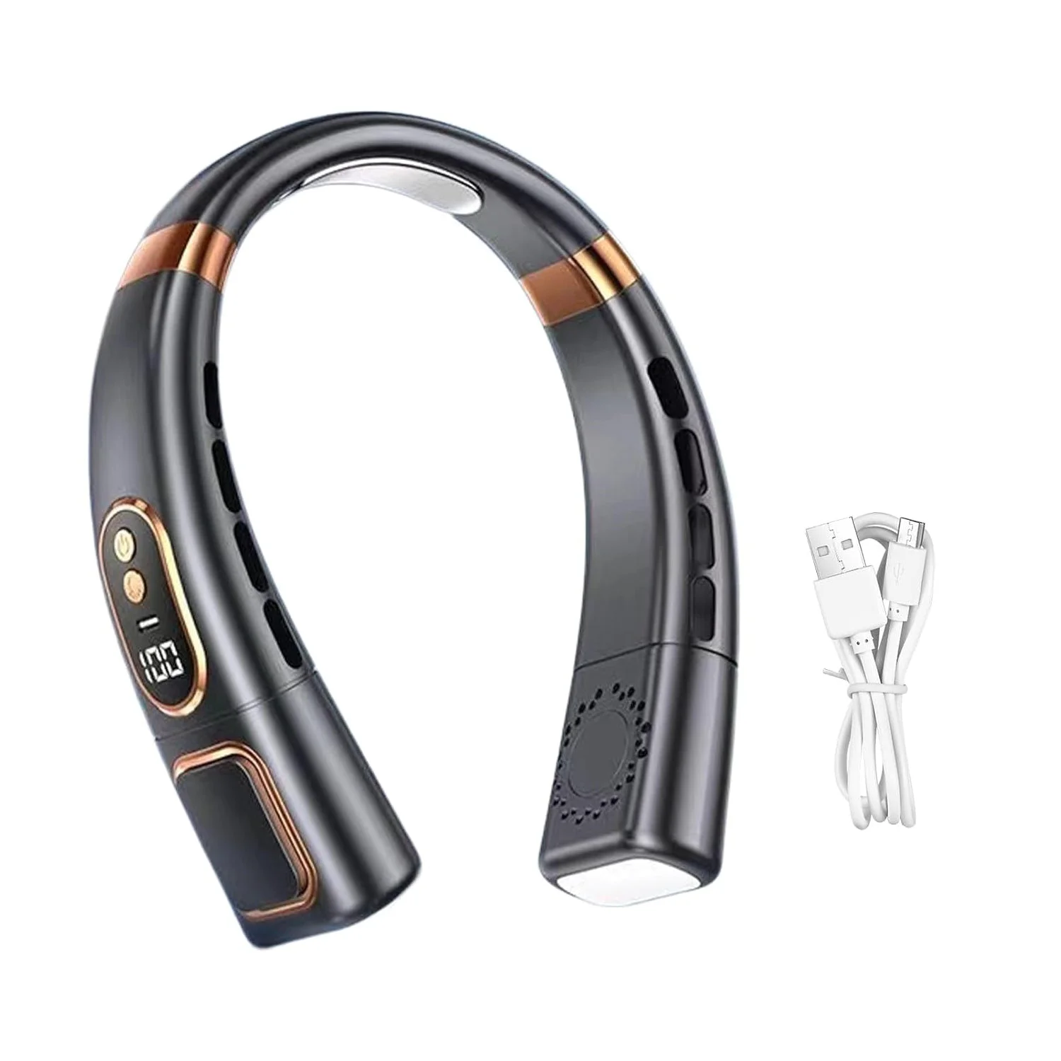 neck fan, wearable fan, USB rechargeable neck fan,personal cooling fan, hands free fan, digital display fan, LED light neck fan, portable cooling fan,portable USB fan, rechargeable wearable fan,summer cooling device, personal air cooler, stylish neck fan