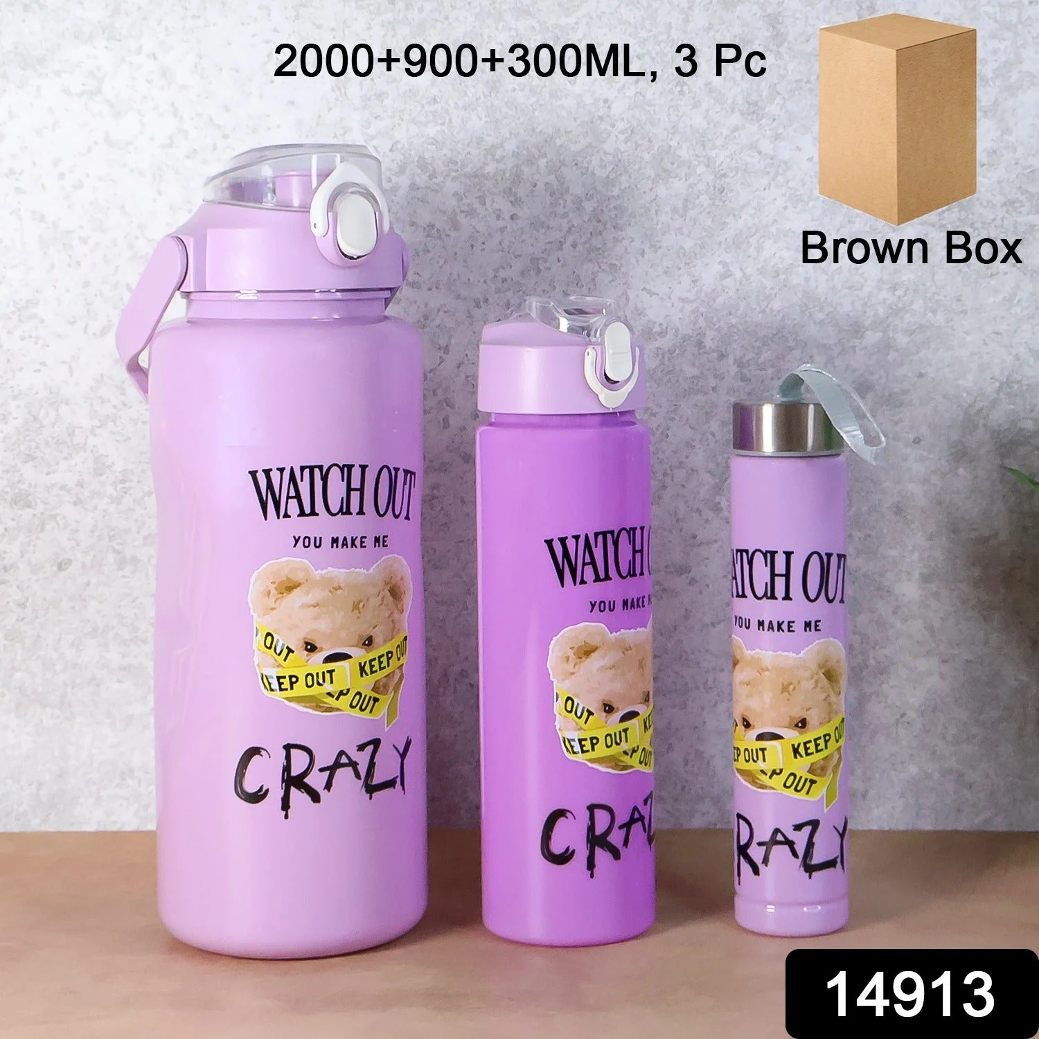 Premium Set of 3 Water Bottles – 2000ML + 900ML + 300ML Leak-Proof Drinking Bottles with Stylish Print, BPA-Free, Reusable & Portable for Home, Office, School, Travel