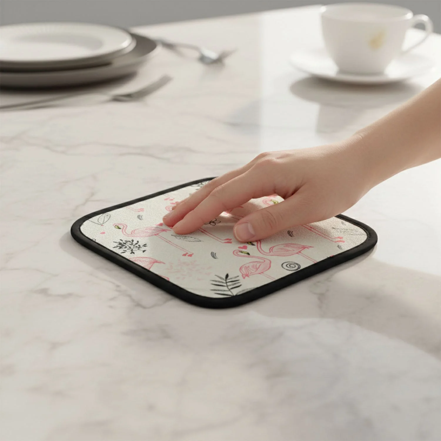 This printed kitchen pot holder mat is designed to protect your kitchen surfaces from heat, scratches, and stains. The compact square shape makes it ideal for placing hot pots, pans, kettles, or serving dishes safely on countertops and dining tables. Its heat-resistant design helps prevent surface damage while adding a decorative touch to your kitchen setup. Lightweight and easy to use, this mat is suitable for daily cooking and serving needs. A practical kitchen accessory that combines protection with style.