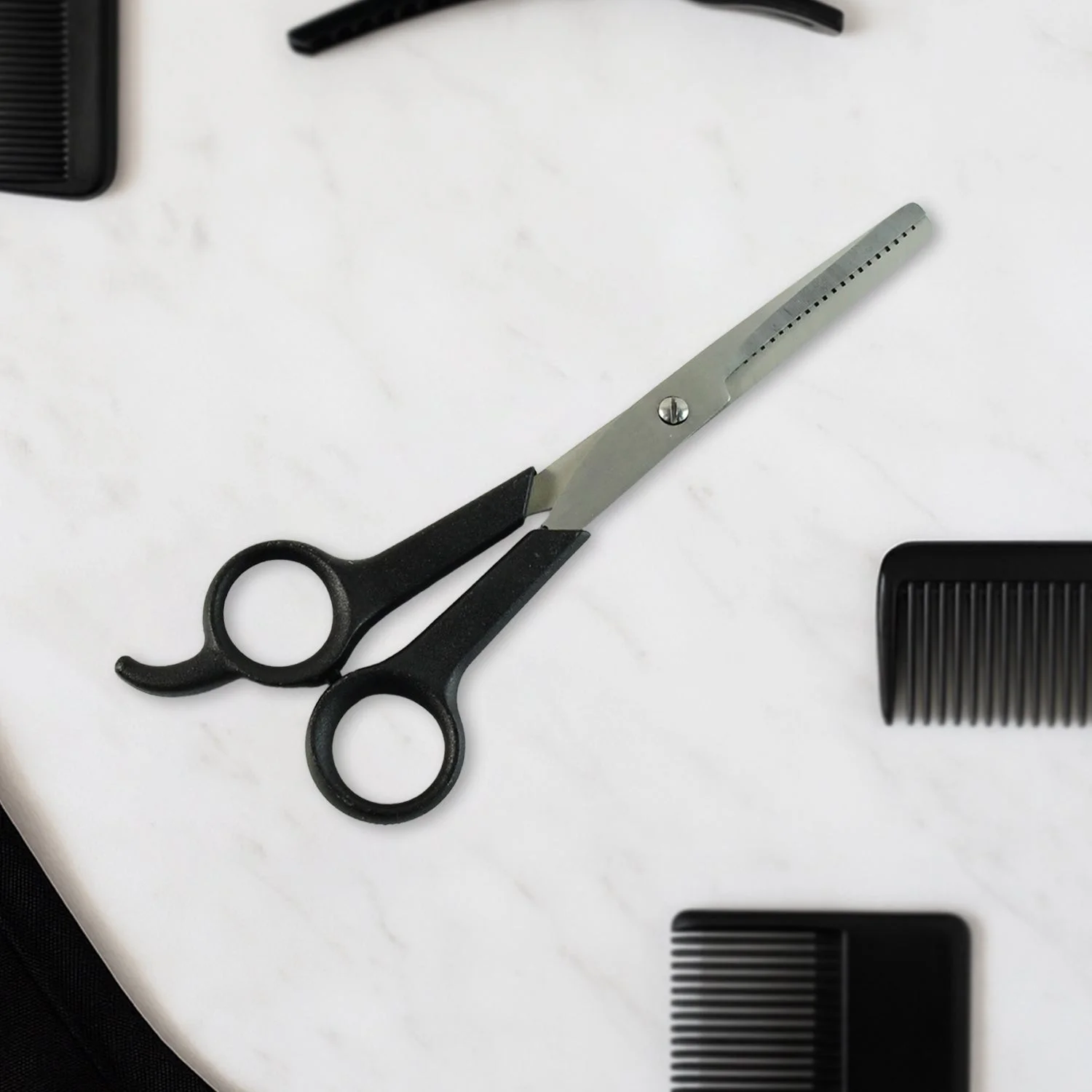 Achieve soft, blended textures and remove bulk without harsh lines using these professional hair thinning scissors. The precision teeth reduce volume evenly, perfect for shaping fringes, refining layers, and softening thick sections. An ergonomic handle with a finger rest supports stable control during longer cutting sessions, helping you work comfortably and accurately. The adjustable tension screw lets you fine-tune the action to your cutting style, from delicate feathering to confident chunk-reduction. Designed for smooth, snag-free movement, these scissors help deliver consistent, salon-like finishes at home or in professional setups. Easy care and reliable construction make them a dependable choice for everyday grooming needs.