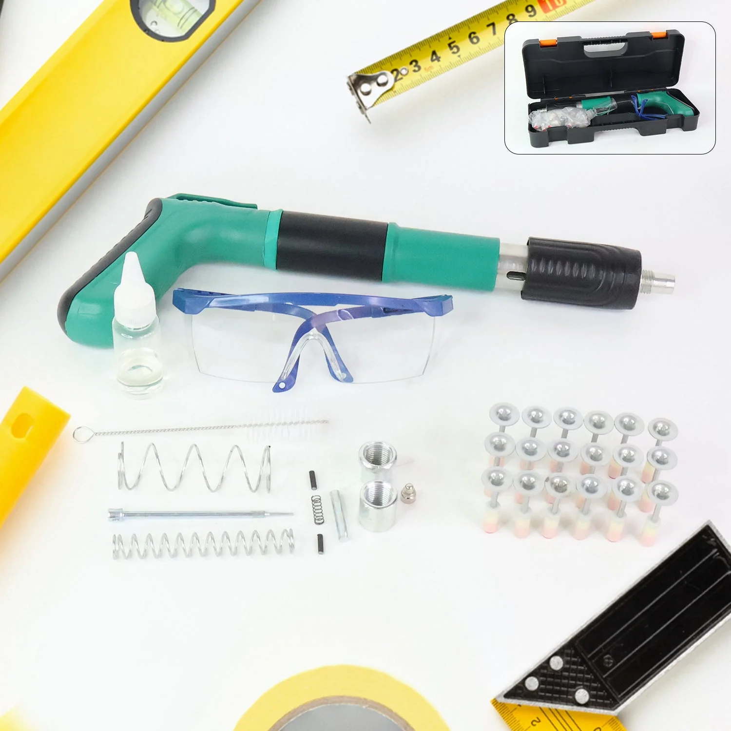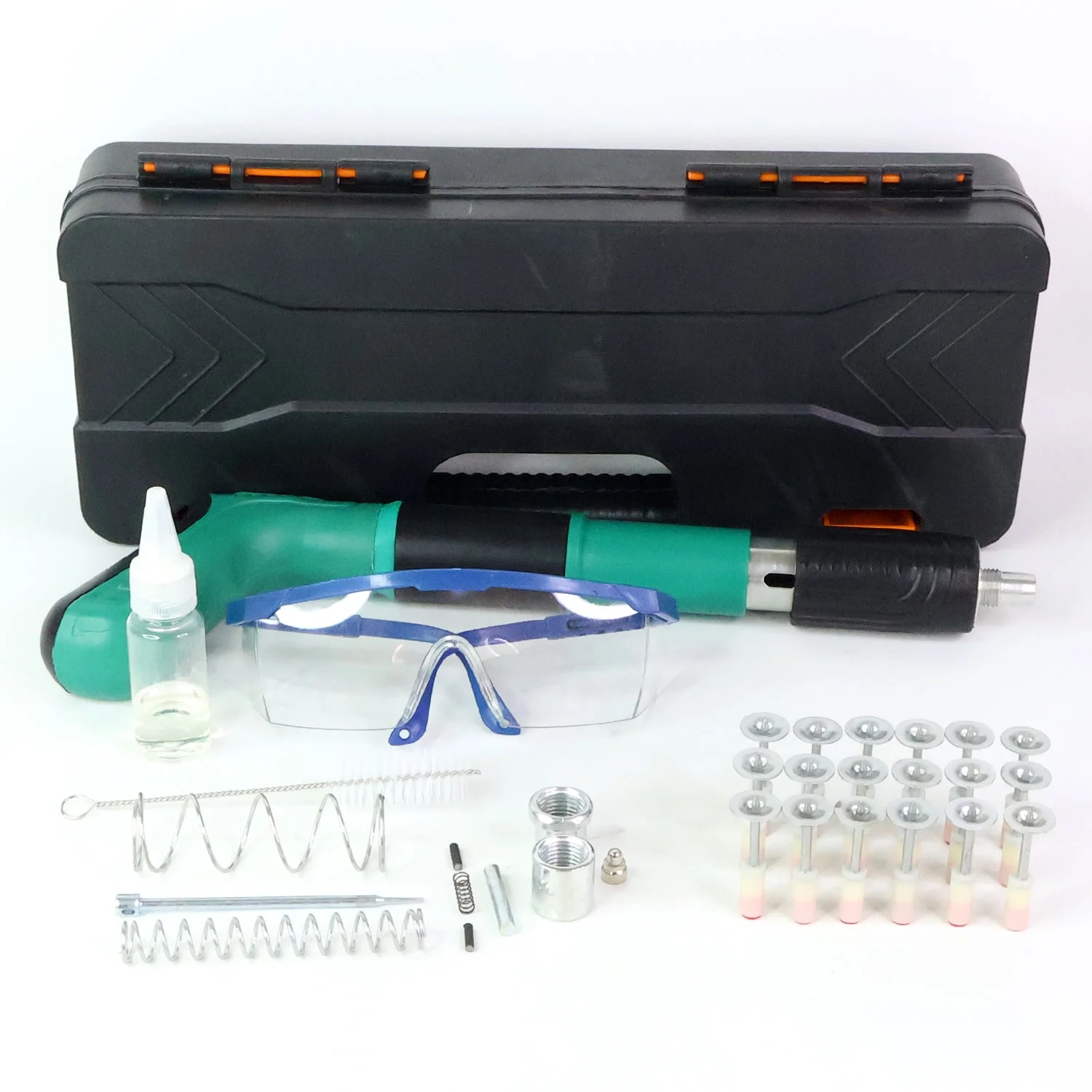 Complete Kit: Includes rivet/anchor fastening tool, safety glasses, springs, screws, and fasteners.