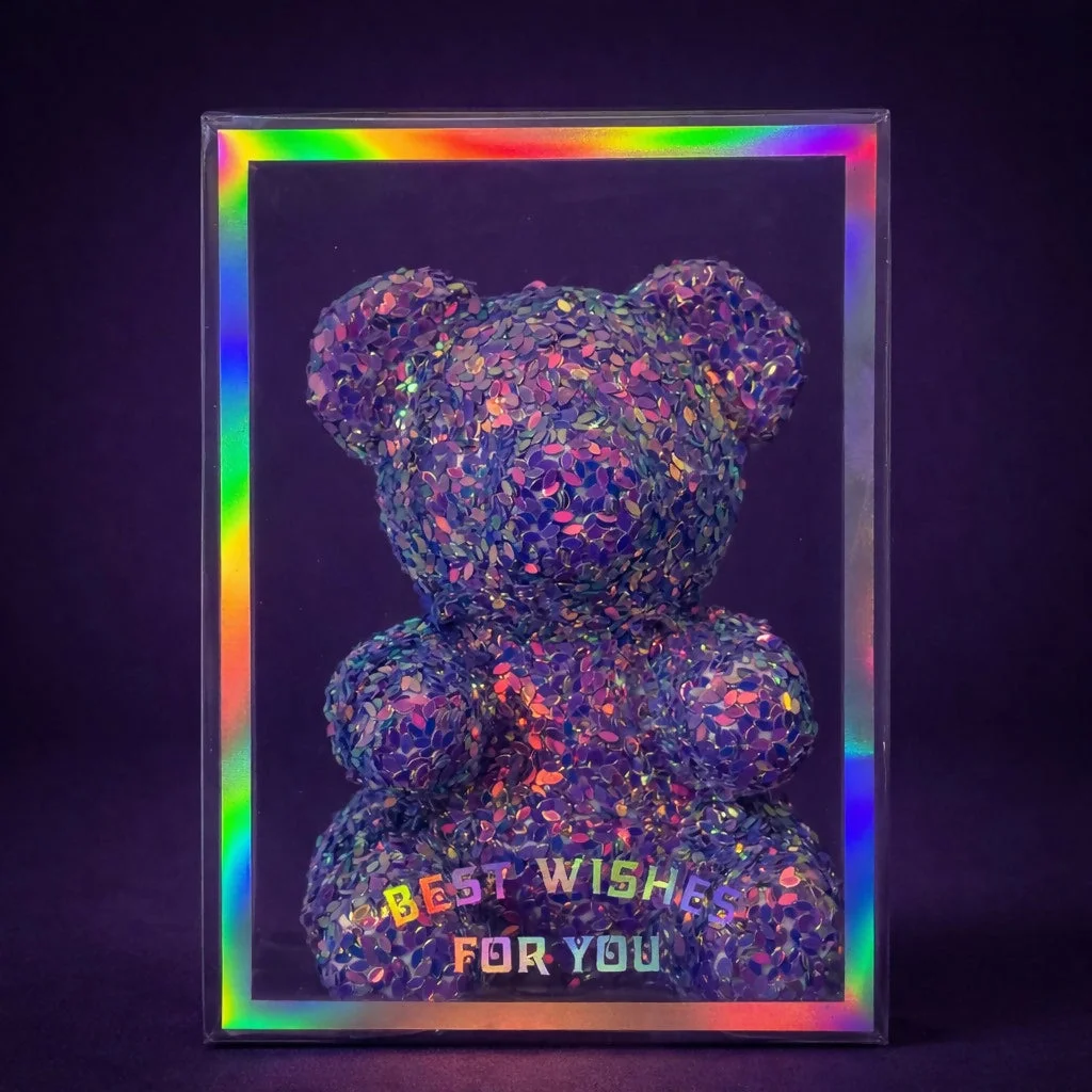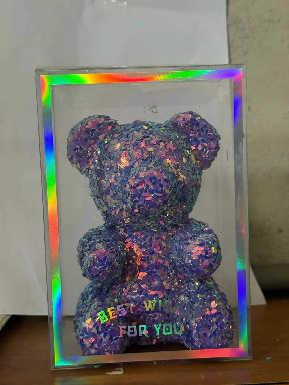 Add sparkle and charm to your gift collection with this beautiful glitter teddy bear showpiece. Designed with colorful shimmering glitter, this adorable teddy bear comes inside an elegant transparent display box with a rainbow-style frame and "Best Wishes For You" message. The stylish presentation makes it perfect for gifting on birthdays, anniversaries, Valentine's Day, or special occasions. Ideal for home décor, desks, shelves, or bedside tables, this decorative teddy bear adds a cute and eye-catching touch to any space.