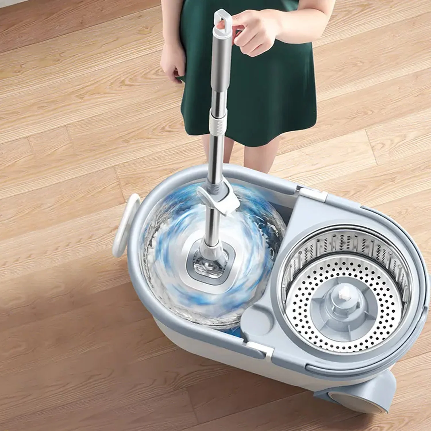 - ALL-IN-ONE SYSTEM: Introducing an all-in-one mopping solution that simplifies your cleaning routine. This system comprises a mop with a microfiber head and a bucket equipped with a spinning mechanism. This mopping machine for floor cleaning features a user-friendly spinning that requires minimal effort to operate. With a smooth spinning motion, the spin chamber effectively wrings the mop head and ensures the water stays in the bucket.