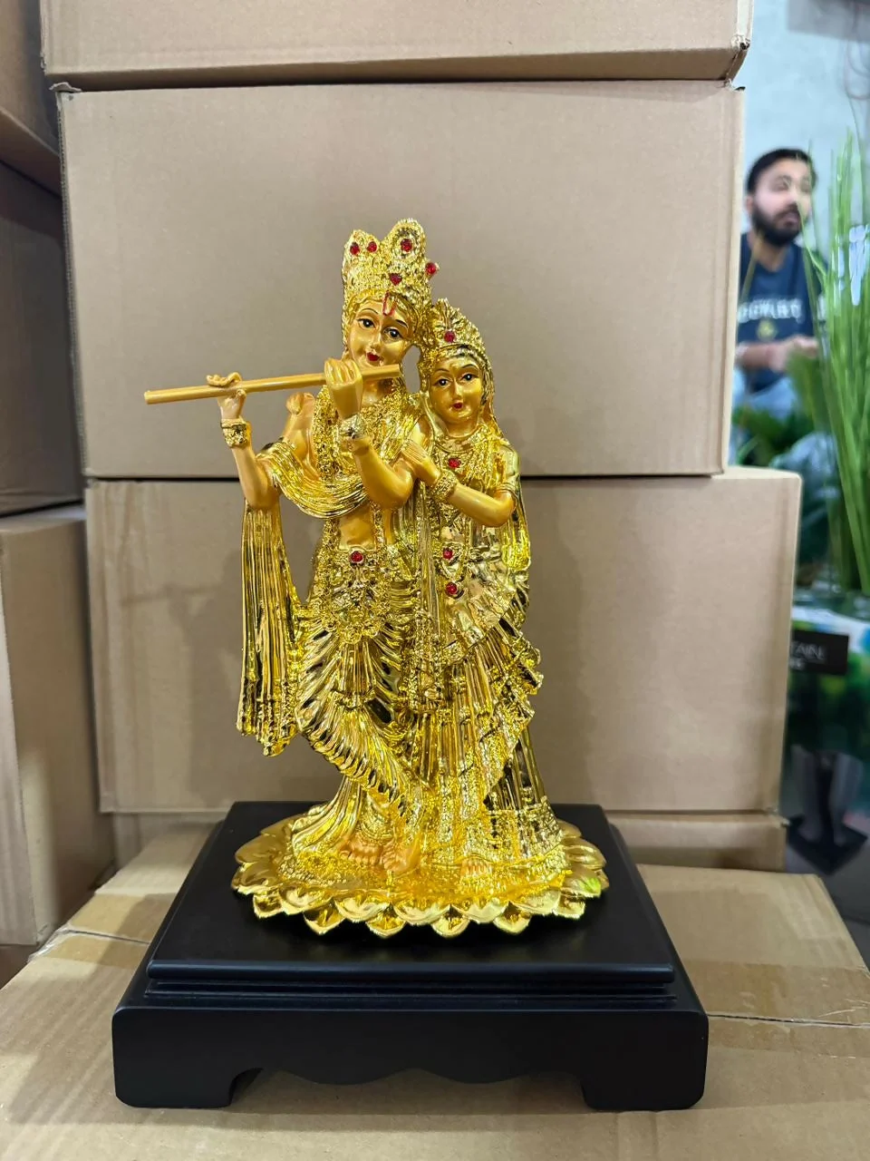 Invite divine blessings and timeless beauty into your home with this elegant Radha Krishna idol. The statue beautifully depicts Lord Krishna playing the flute while Radha stands beside him, symbolizing eternal love, devotion, and spiritual harmony. Crafted with intricate detailing and a radiant golden finish, this idol enhances the sacred atmosphere of any pooja room, home temple, living room, or meditation space. The statue is mounted on a sturdy decorative base that ensures stability and enhances its premium appearance. Perfect for daily worship, festive décor, and gifting on occasions such as Janmashtami, Diwali, housewarming ceremonies, weddings, and spiritual celebrations.