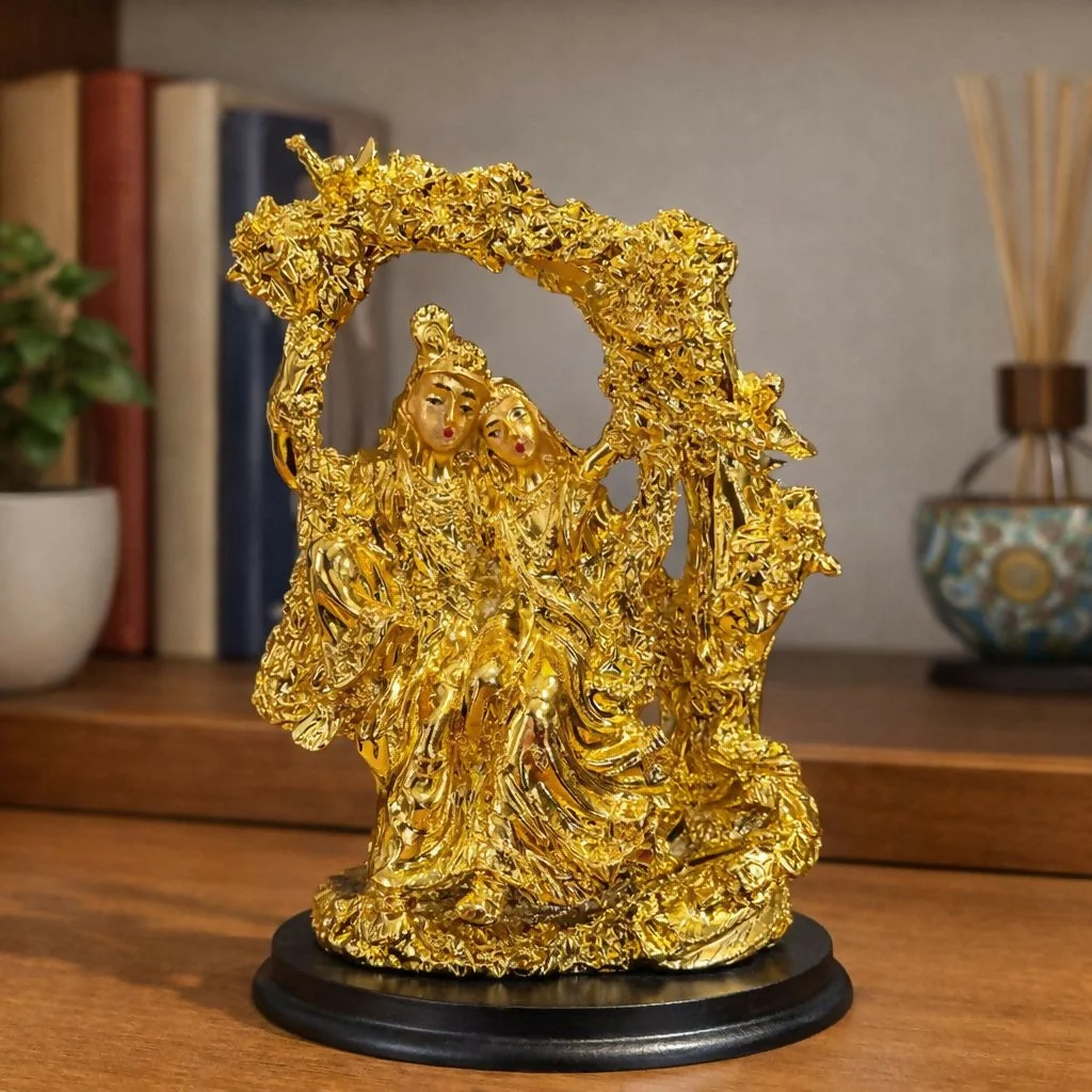 Enhance your home temple and décor space with this beautifully crafted Radha Krishna idol featuring an elegant decorative arch design. Symbolizing eternal love, devotion, and harmony, this detailed showpiece adds spiritual charm and artistic beauty to your pooja room, living area, or office. The intricate craftsmanship and rich metallic finish make it a stunning centerpiece for daily worship and festive decoration. It also serves as a meaningful gift for weddings, anniversaries, housewarming ceremonies, and religious occasions.