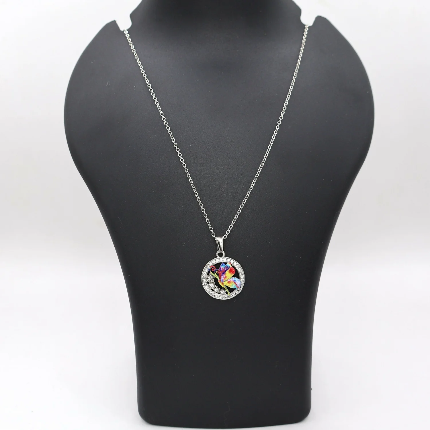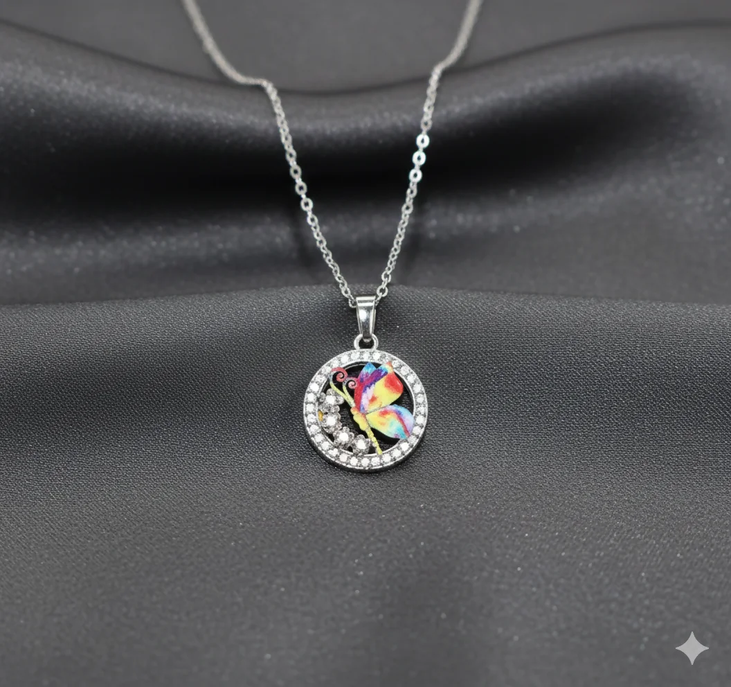 The butterfly is set within a polished circular frame, which is beautifully bordered by a sparkling Cubic Zirconia (CZ) halo. The halo is made of brilliant, pave-set stones that contrast beautifully with the vibrant central design, drawing all eyes to the pendant. It hangs from a delicate, shimmering silver-tone chain.