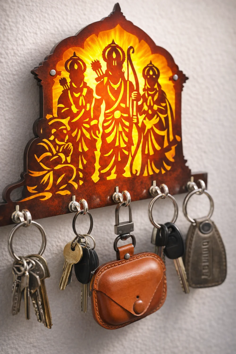 Add a spiritual touch to your home with this Ram Darbar Wooden Key Holder. Beautifully crafted with detailed design, it helps keep your keys organized while enhancing your wall décor. Perfect for home entrances, living rooms, or as a thoughtful gift. 🙏✨