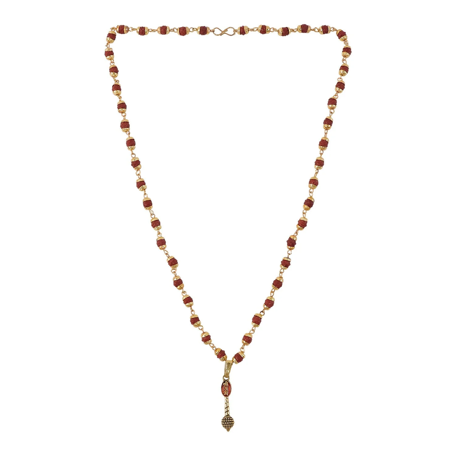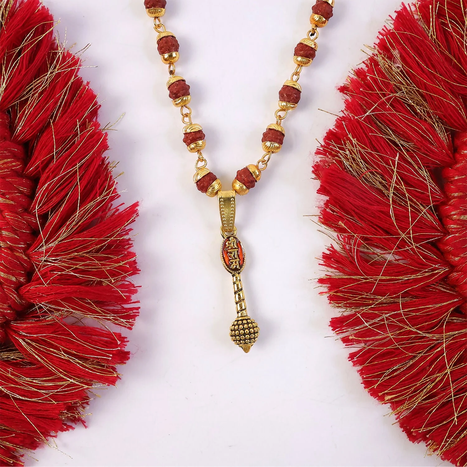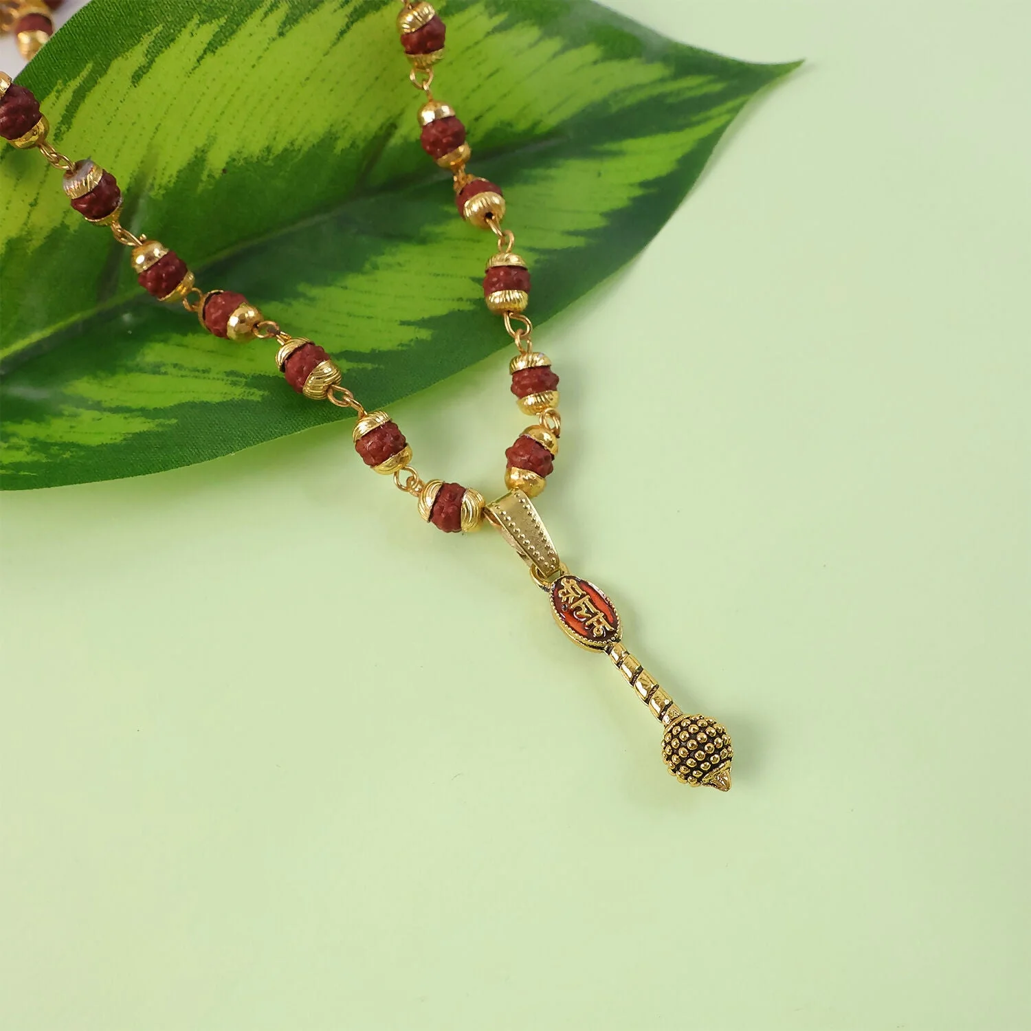 Showcase your devotion with this beautifully crafted Gold Plated Ram Naam Gada Pendant Necklace. Featuring a detailed gada design with sacred “Ram” inscription and paired with classic Rudraksha beads, this necklace symbolizes strength, faith, and protection. Perfect for daily wear, spiritual gatherings, or as a meaningful gift for loved ones.