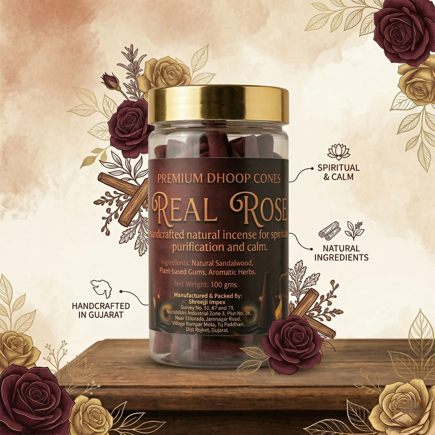 Indulge in the soothing fragrance of Shreeji Real Rose Premium Dhoop Cones, thoughtfully crafted to create a calm and spiritually uplifting environment. Made using natural ingredients including aromatic herbs and plant-based gums, these dhoop cones release a rich rose-inspired aroma that enhances your surroundings with warmth and serenity. Ideal for daily rituals, meditation, and relaxation, the cones burn slowly to provide a long-lasting and consistent fragrance experience. The handcrafted formulation ensures purity and quality, making it perfect for spiritual practices and home ambiance. Packed in a premium jar, it preserves freshness while offering convenience in storage and use.