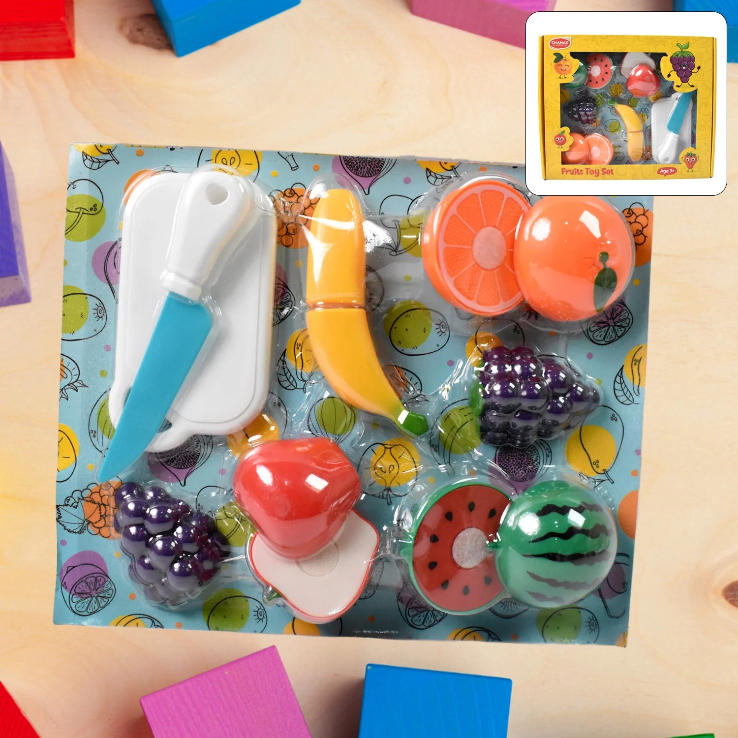 - Package Includes Apple, Grapes, Orange, Watermelon, Banana, Chopping Board, Knife 7 Pcs Set.