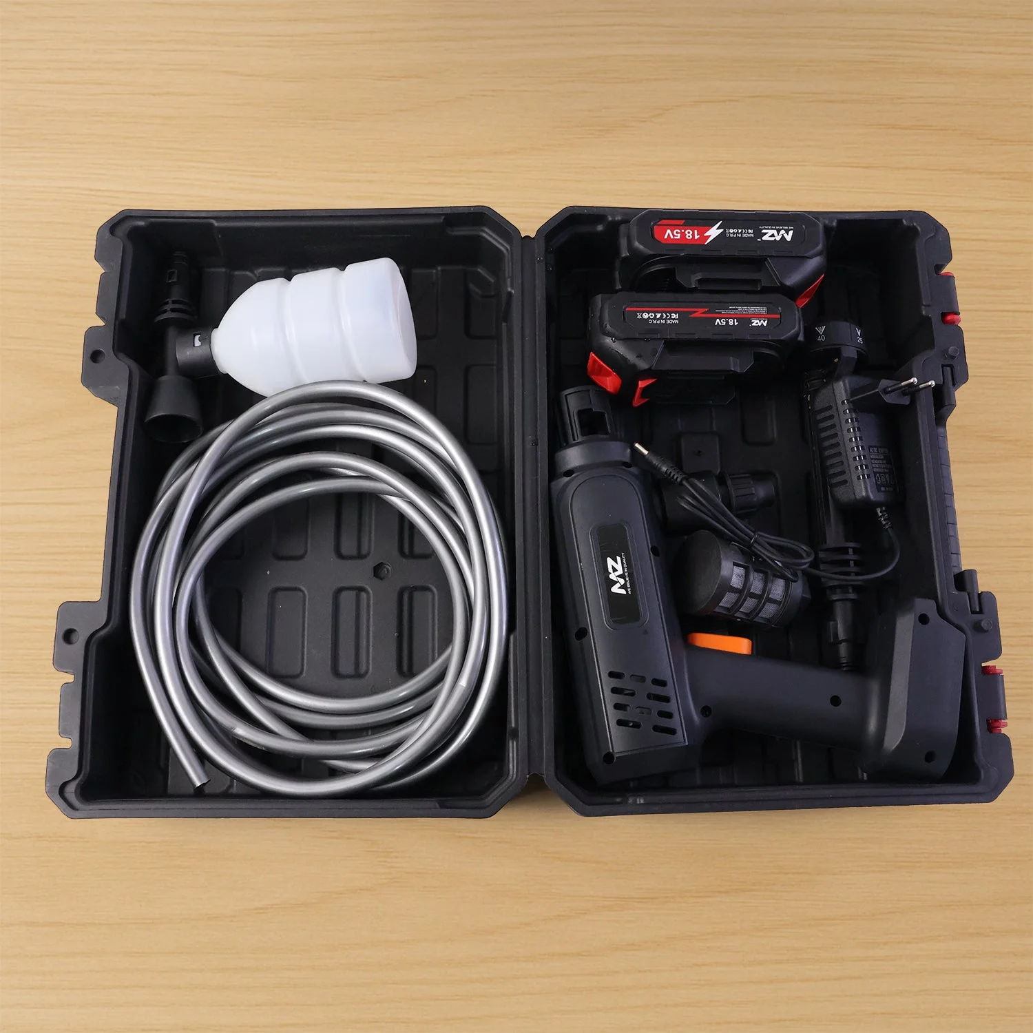 Set Contents: Spray gun, battery pack, charger, hose pipe, nozzle