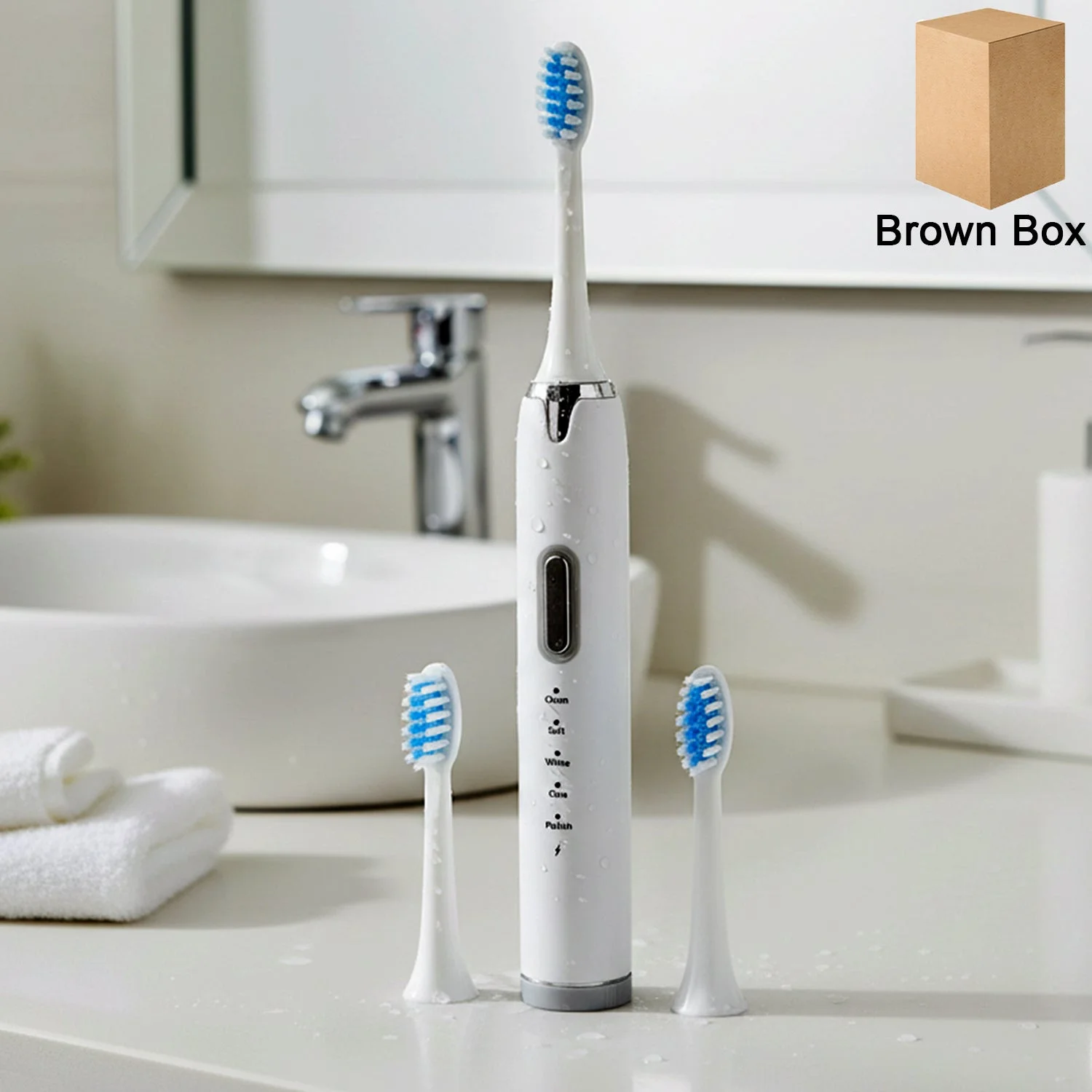 Multiple cleaning modes printed on the handle (clean / soft / white / care / polish style options) to suit different needs and sensitivities.