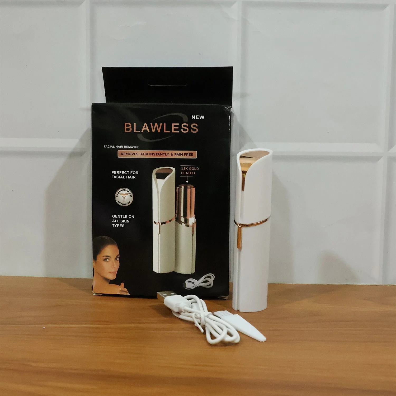 Set Includes: Hair remover device, cleaning brush, charging cable