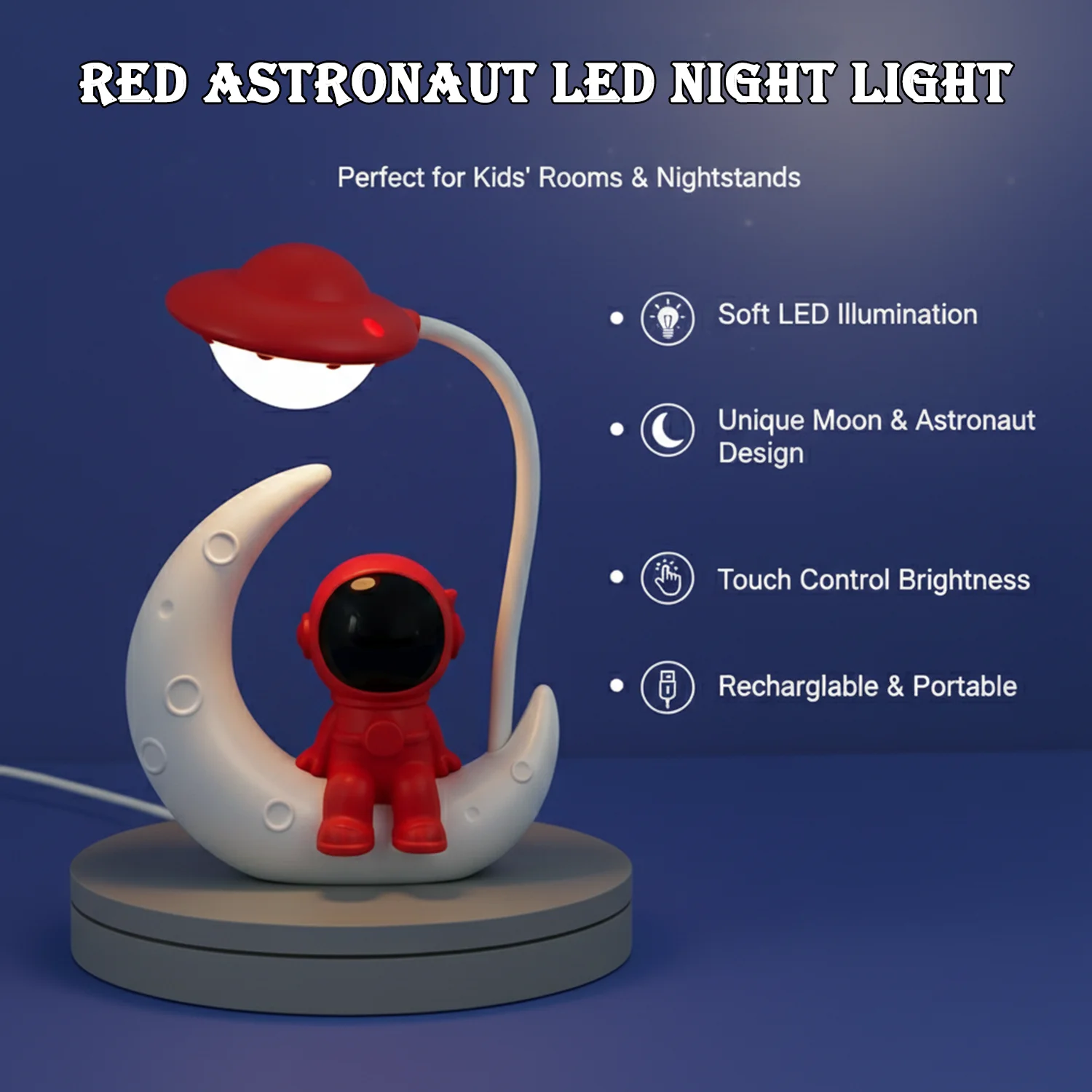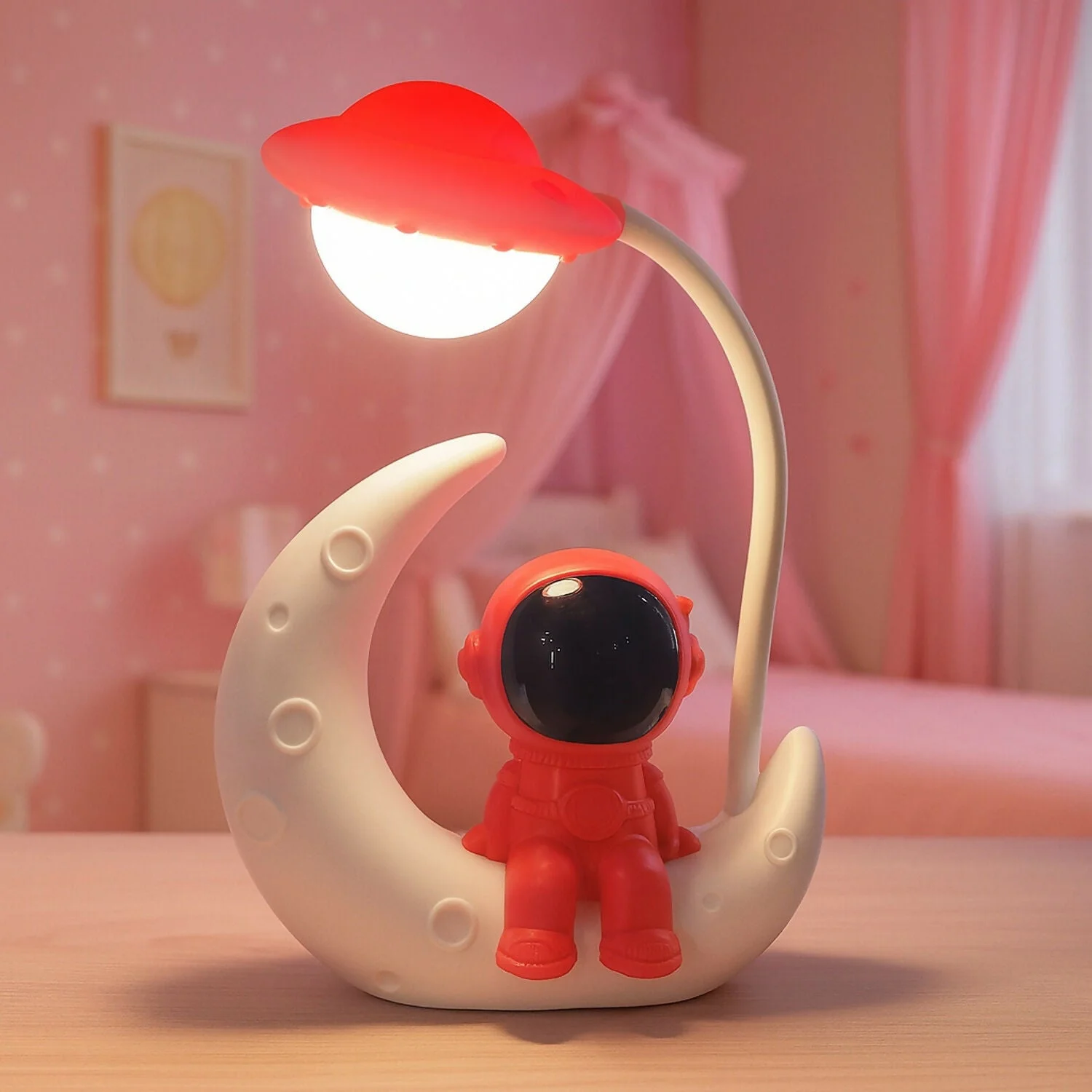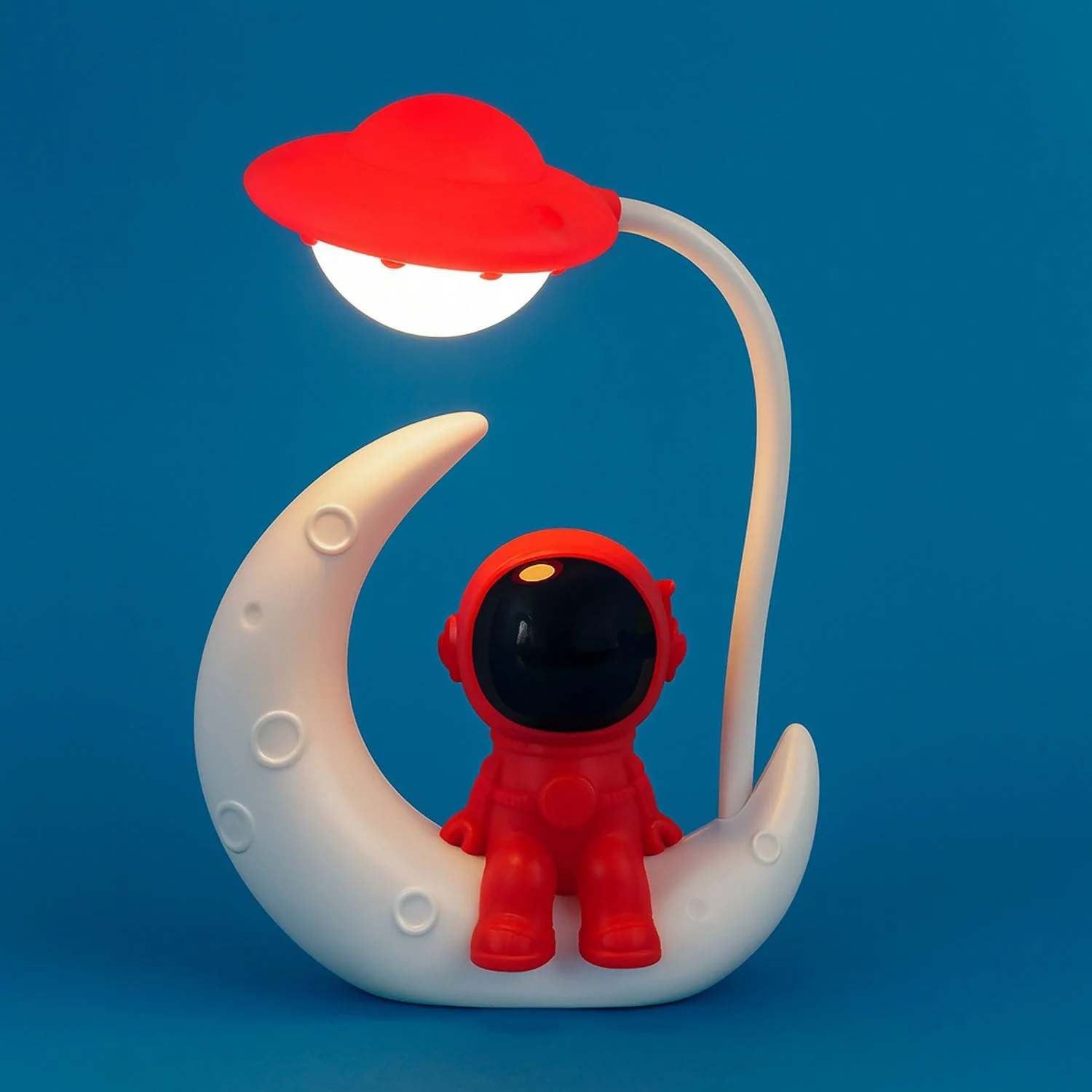 red astronaut lamp, moon led night light, kids night lamp, space night light, astronaut moon decor, bedside night lamp, nursery lamp for baby, usb rechargeable night light, gift for kids room, study table lamp, home decor lighting, astronaut gift item