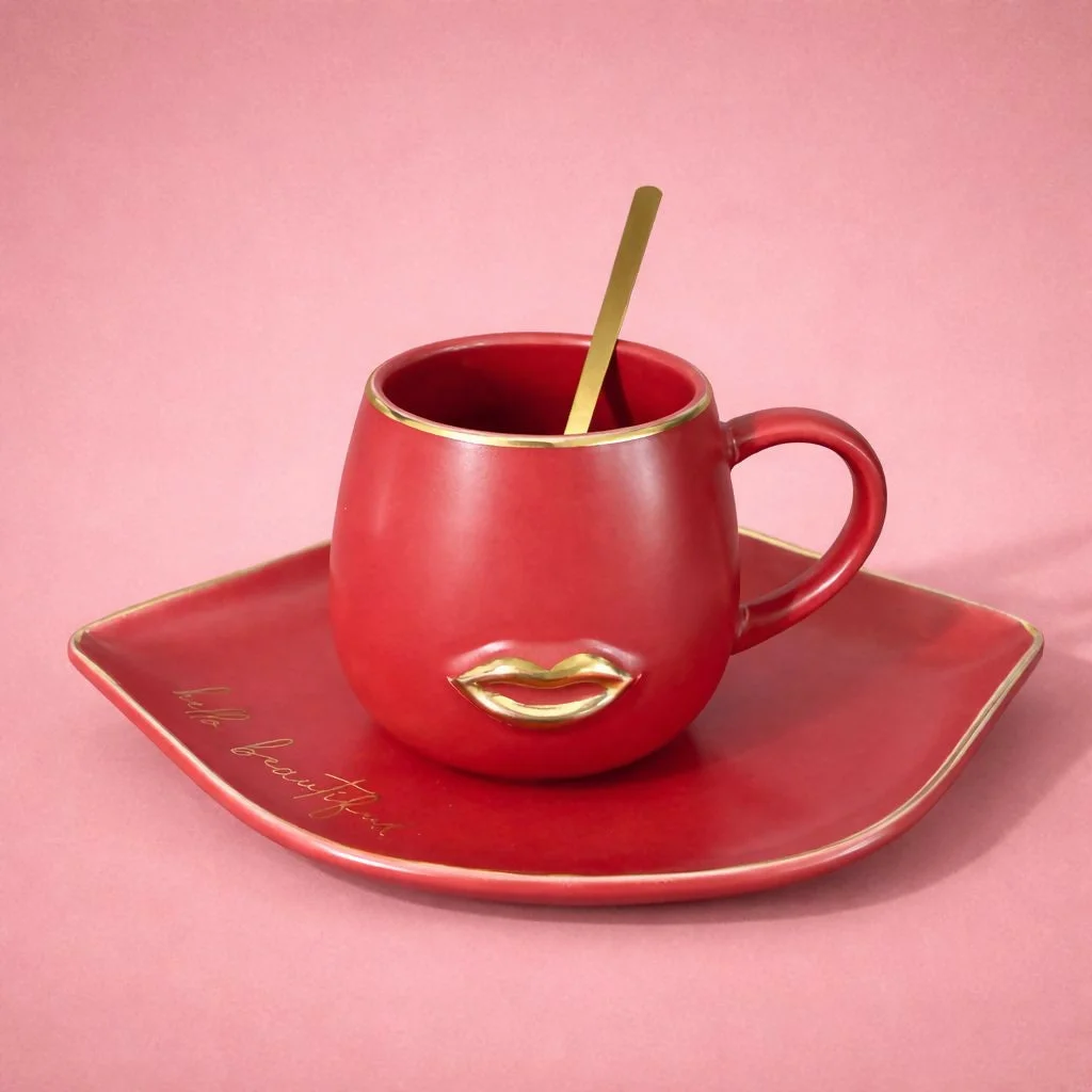 Add elegance and charm to your tea or coffee time with this stylish ceramic mug set featuring a decorative lip design. This beautiful set includes a premium ceramic mug, a matching serving tray, and a spoon, making it perfect for serving coffee, tea, milk, or hot beverages. The modern design with a glossy finish and gold accents enhances the aesthetic appeal of your kitchen, dining table, or coffee corner. Ideal for everyday use or special occasions, this mug set also makes a thoughtful gift for friends, family, or loved ones on birthdays, housewarmings, or festive celebrations.