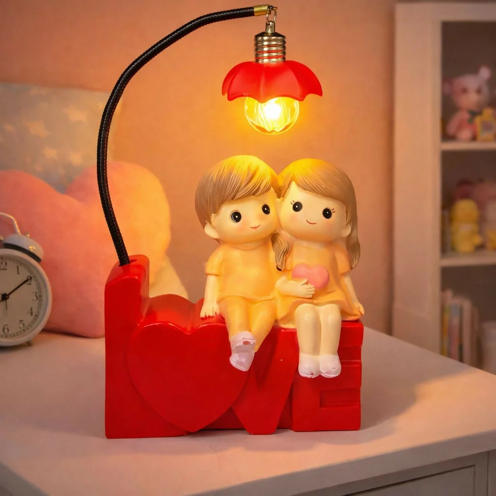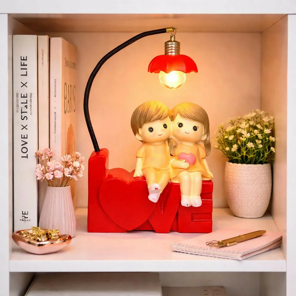 Enhance your space with this charming romantic couple lamp showpiece, designed to create a warm and cozy ambiance. Featuring a cute boy and girl sitting together on a “LOVE” base, this decorative lamp adds a touch of affection and style to any room. The soft glowing light with a flexible neck and floral shade makes it perfect for bedside tables, desks, or shelves. Ideal for gifting and home décor, this lamp brings a soothing and heartwarming vibe to your surroundings.