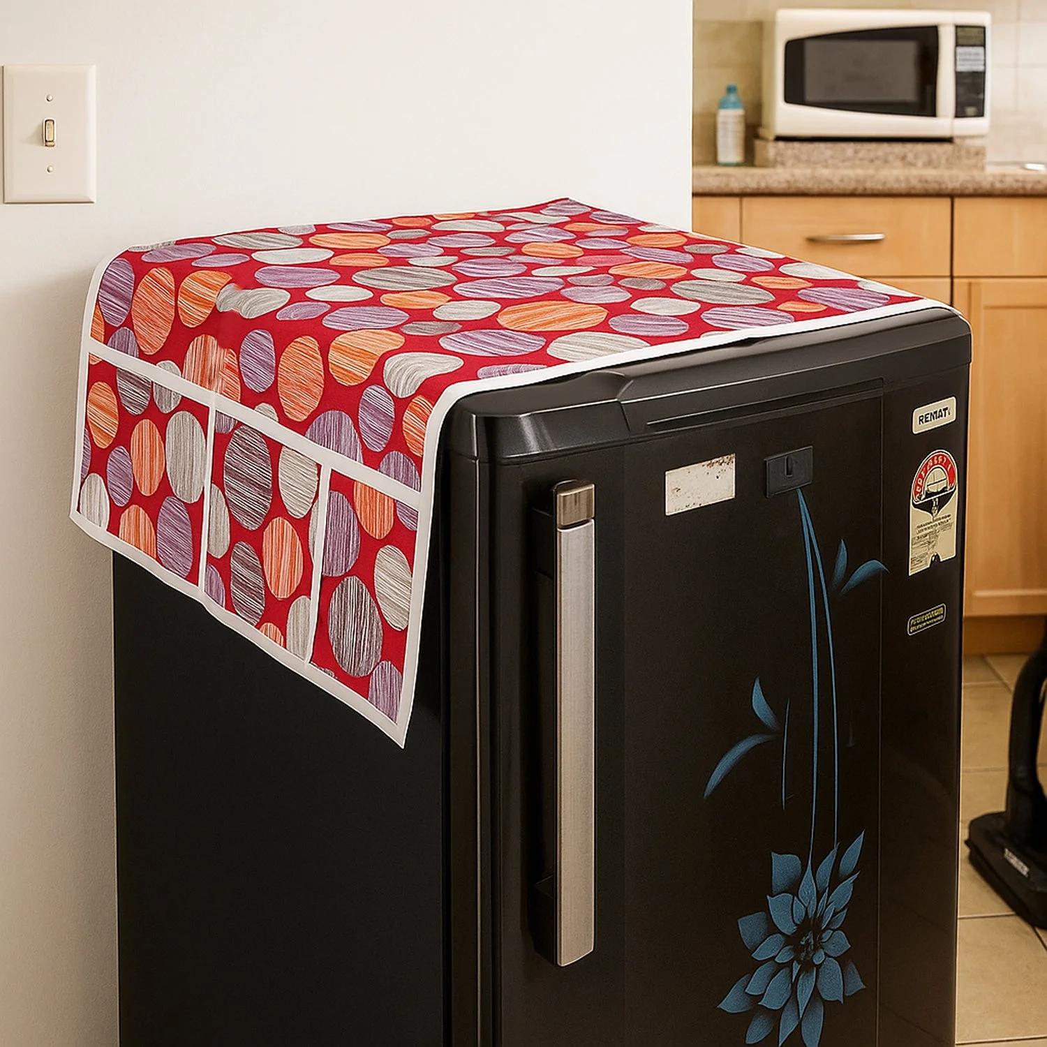 Give your refrigerator a neat, colorful upgrade while protecting it from dust, moisture, and everyday kitchen splashes. This premium fridge top cover lays flat and stays put, keeping the surface clean and scratch-free without slipping or bunching. The quick-wipe surface cleans in seconds, and the bound edges help it keep shape after repeated use and washing. Built-in side pockets on both sides add handy storage for small kitchen essentials like oven mitts, foil, napkins, or bills—so the top of your fridge stays clutter-free and organized. A bold, modern print freshens up the look of your kitchen and complements a wide range of interiors.