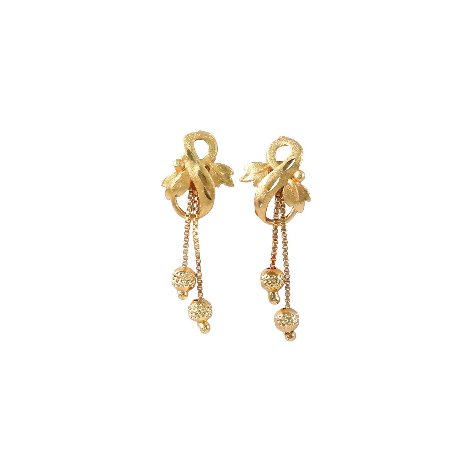 Elegant Leaf Motif Gold Drop Earrings with Triple Chain Bead Dangles