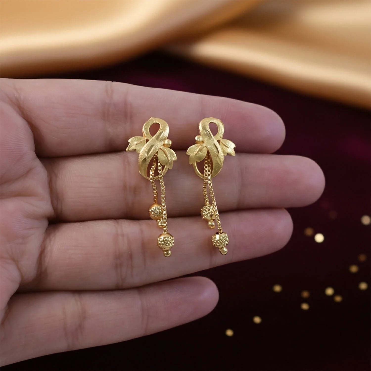 Beneath the decorative top, a circular element connects to three fine gold chains that cascade gracefully downward. Each chain ends with intricately textured bead drops, adding gentle movement and subtle sparkle. As the earrings sway, the dangling beads catch the light beautifully, creating a shimmering effect that adds charm and elegance to your overall look.