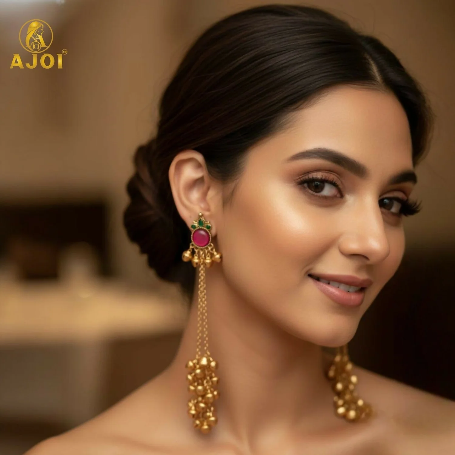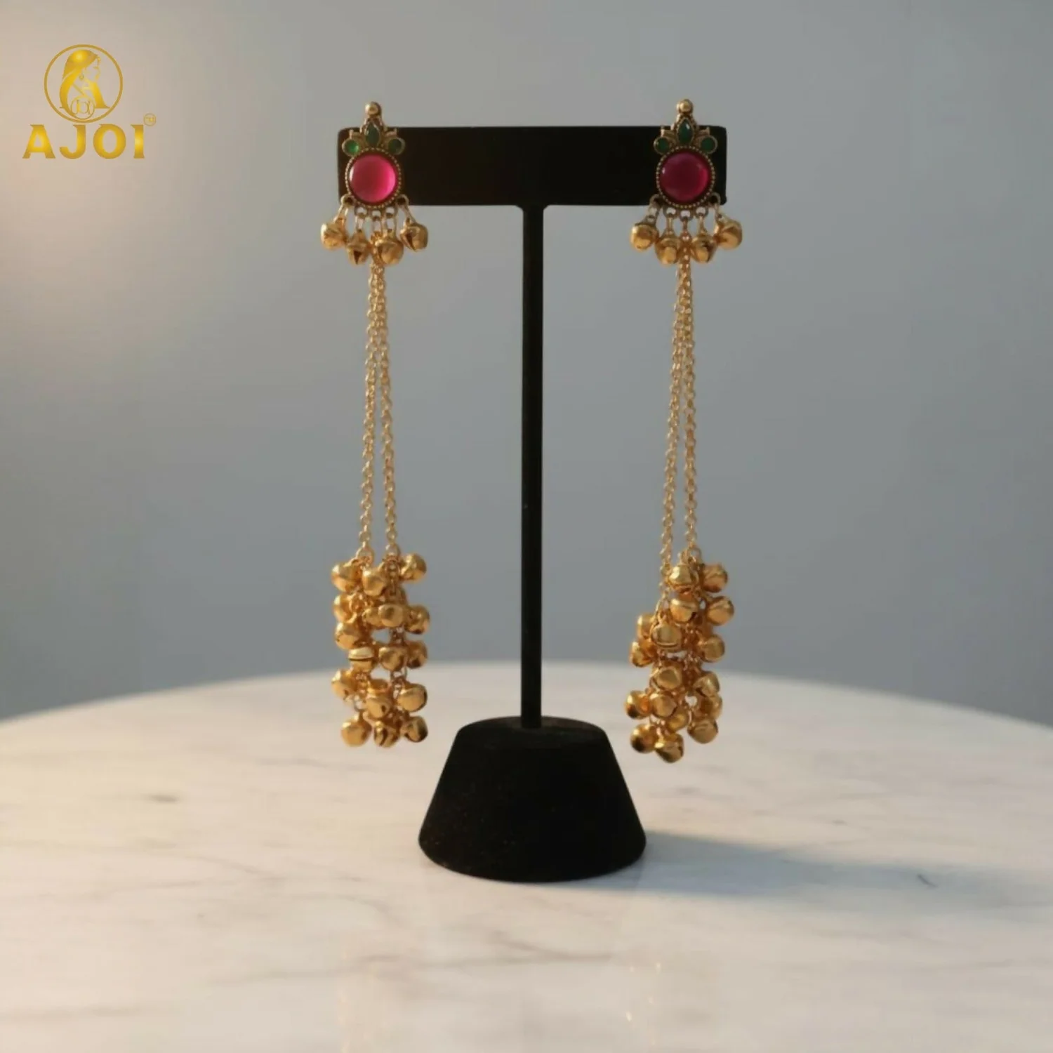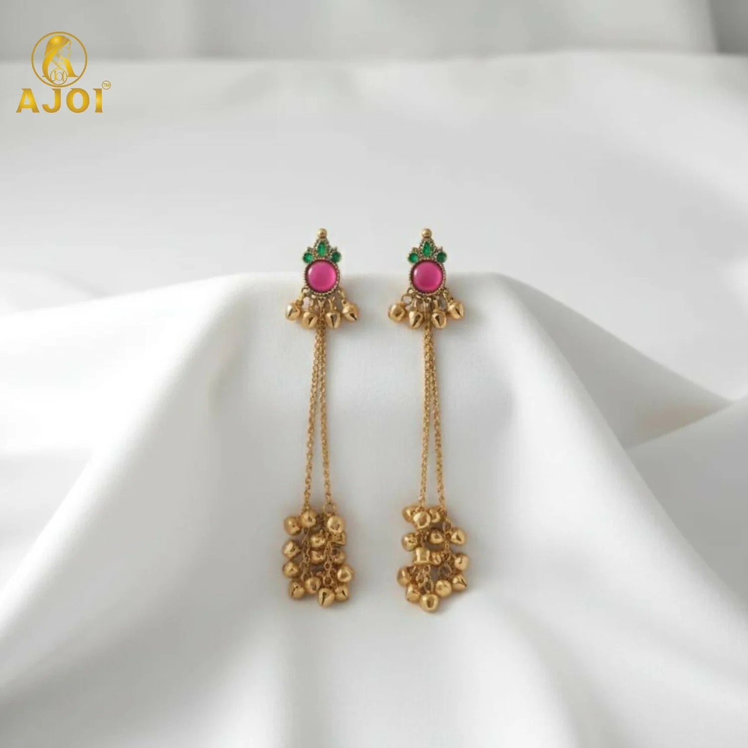 Inspired by the timeless jewellery heritage of Kashmir, these traditional Ghunghroo Kashmiri earrings reflect the soulful artistry of the valley. Crafted in an antique gold finish, the design features a pink stone centerpiece (chips-style) symbolising grace and femininity, beautifully complemented by delicate green accents.