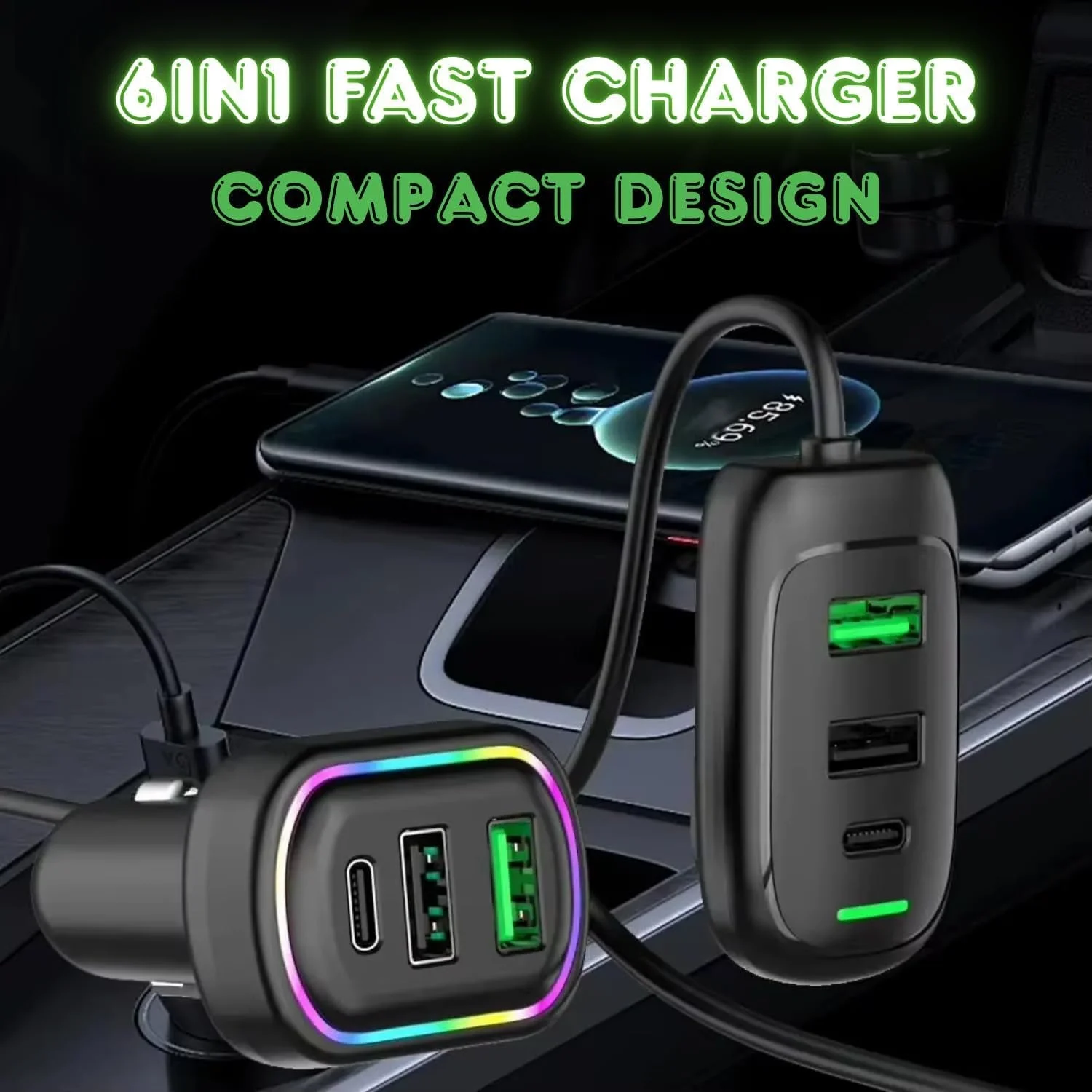 RGB Breathing Light Multi Port Car USB Charger with Type-C Fast Charging Car Adapter Extension Cable Car Mobile Charger for Smartphones Tablets GPS and Car Accessories – 1 Set 1.5M