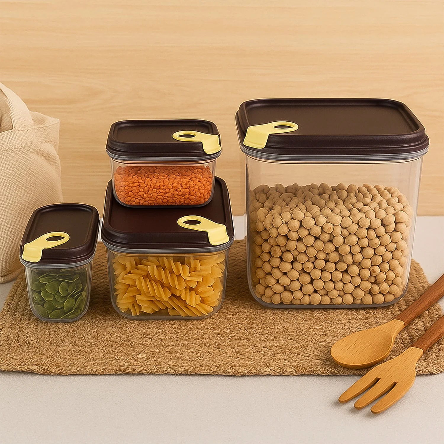 Organize your kitchen in style with the Ritu Push 'N' Lock Airtight Storage Container Set. This 4-piece container set is designed with a unique vacuum-lock mechanism that keeps food fresh longer by sealing in freshness and preventing moisture and pests. The crystal-clear BPA-free plastic body allows for easy visibility of contents, while the push-button locking lid ensures hassle-free access and secure closure. Ideal for modern kitchens, these containers are perfect for storing everything from snacks and cereals to pasta and dry fruits.