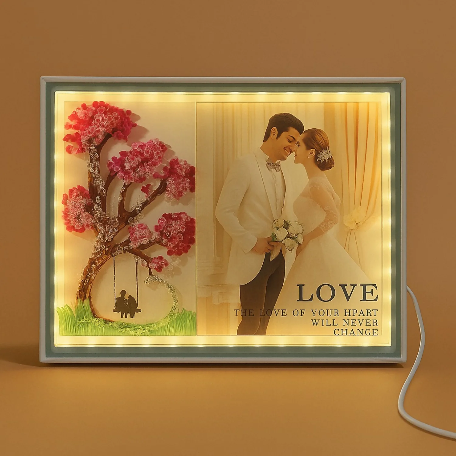 LED photo frame, couple swing frame, 3D tree artwork photo frame, romantic picture lamp, wedding gift for couple, anniversary LED frame, USB powered photo lamp, illuminated picture frame, glowing love frame, bedside love lamp, Valentine couple gift, romantic home décor item, couple swing LED frame, textured floral art frame, wedding room decor