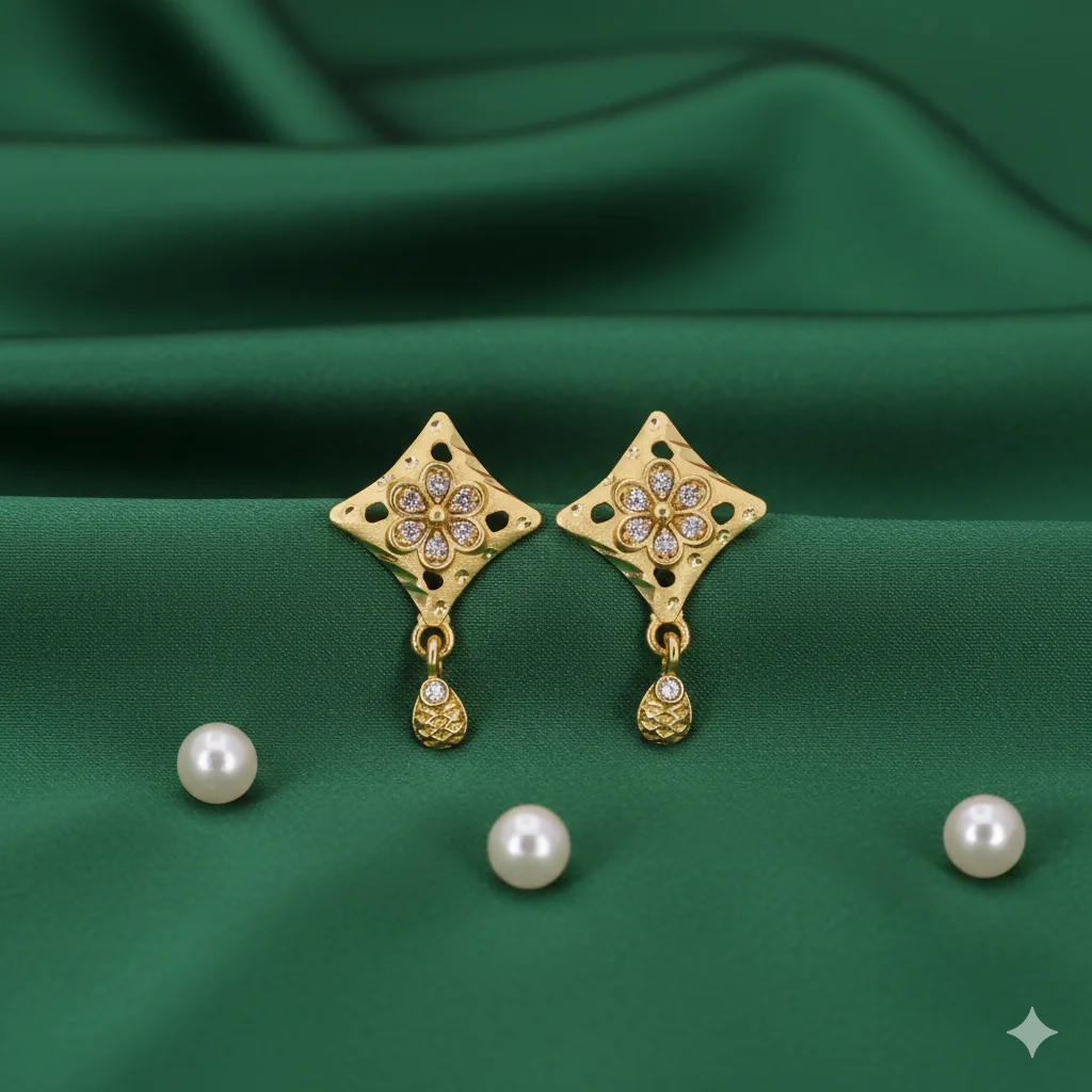 Intricate Design: The main body features a geometric, kite-shaped stud housing a stunning, multi-petal flower motif at its center, meticulously detailed with sparkling simulated diamonds.