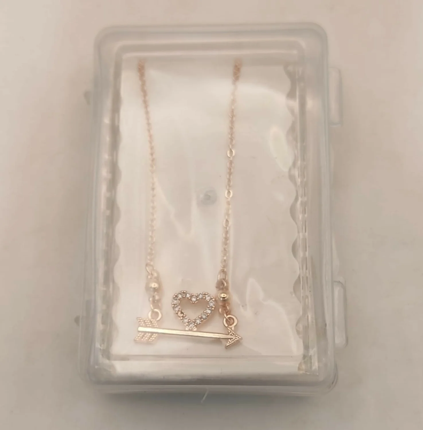 The heart is delicately embellished with dazzling, brilliant-cut cubic zirconia (or similar clear stones) that catch the light beautifully, adding a subtle sparkle to your look. The arrow design is flanked by small, polished rose gold beads on the dainty chain, creating an eye-catching focal point.