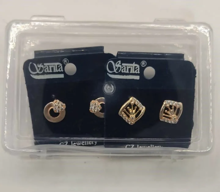 Design 1 (Top Pair): Features a unique, sparkling Crown or Tiara motif set within a diamond-shaped frame. The brilliant cubic zirconia (CZ) stones catch the light for a regal, sophisticated look.
