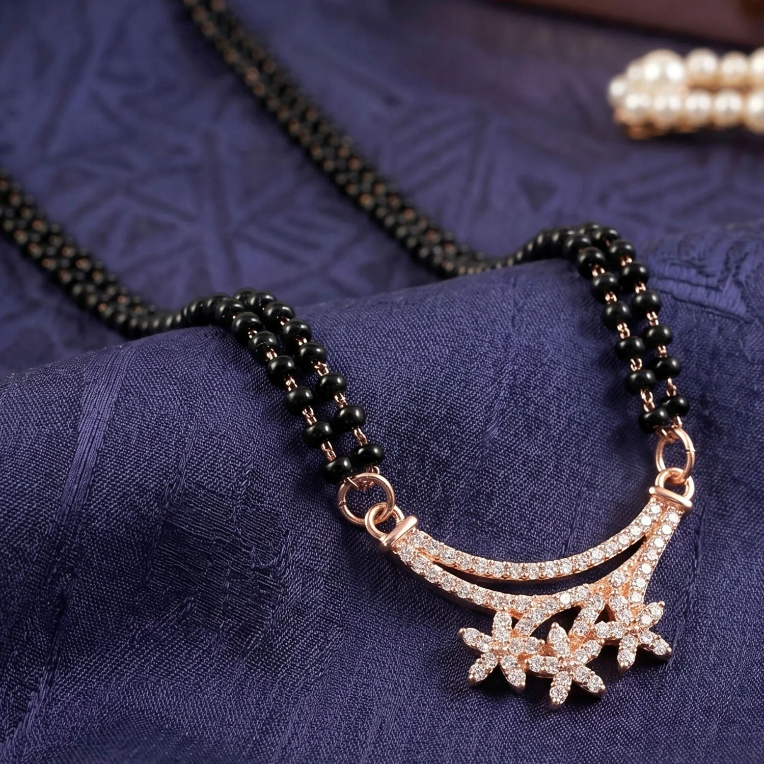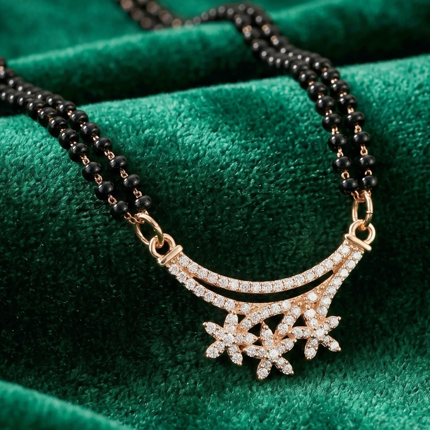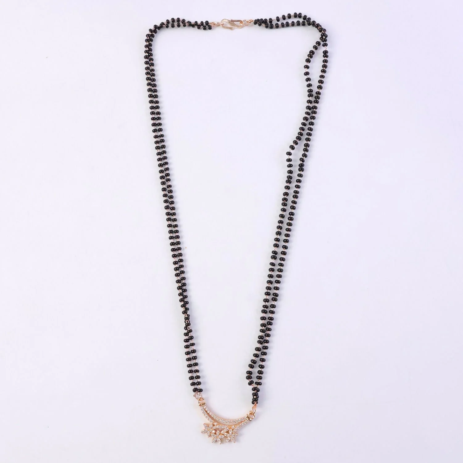 Be the first to review Rose Gold Finish Triple Starburst CZ Cluster Pendant Double Strand Mangalsutra!