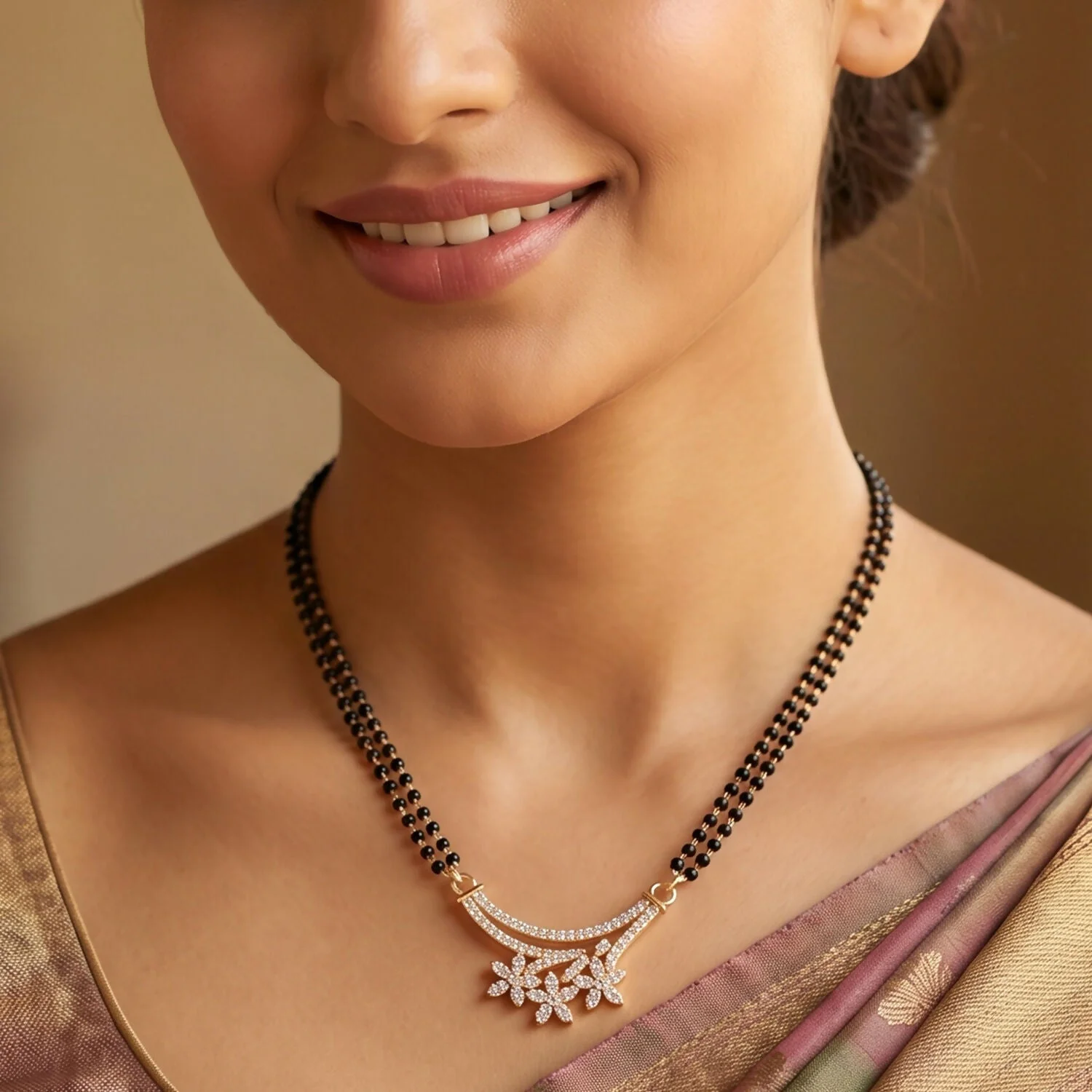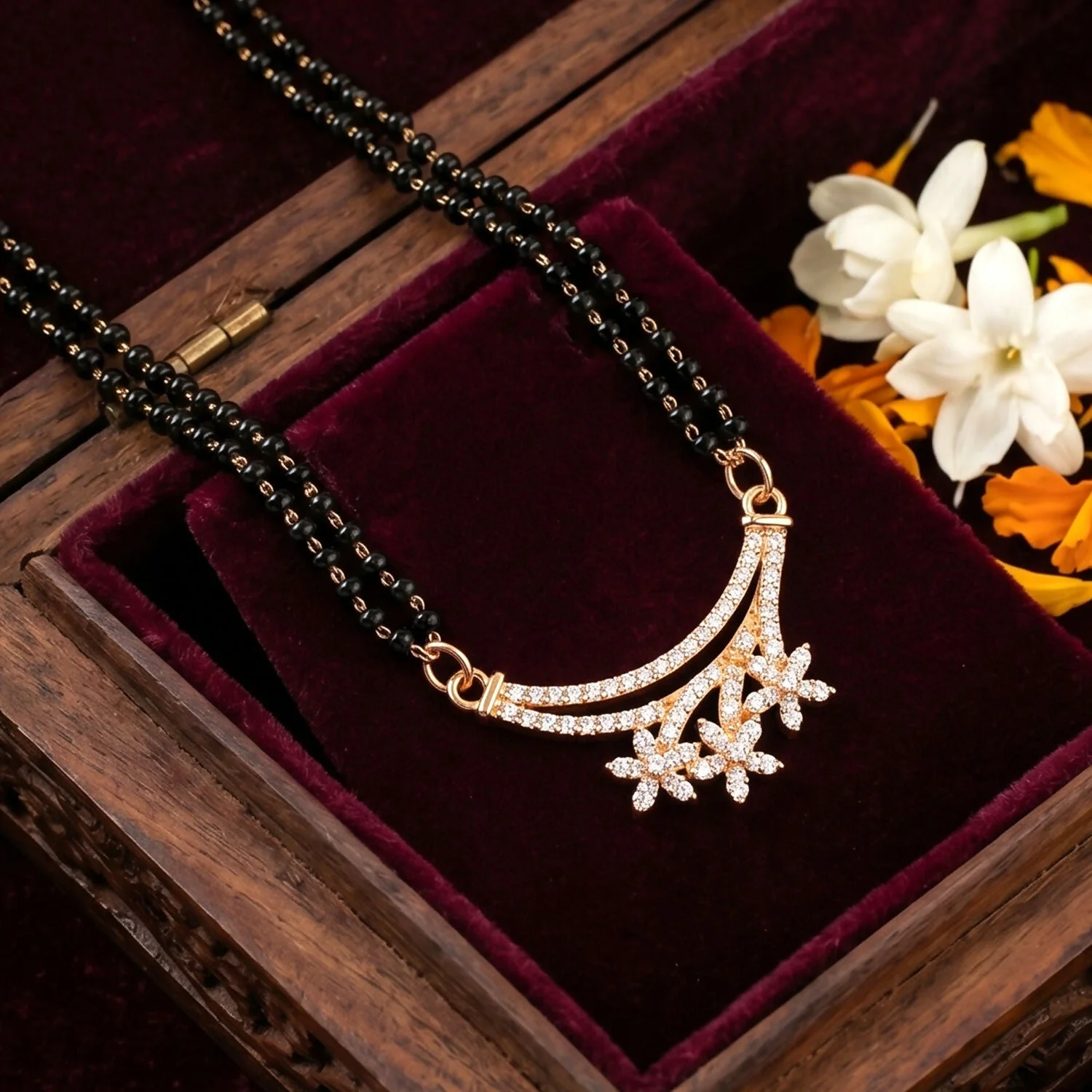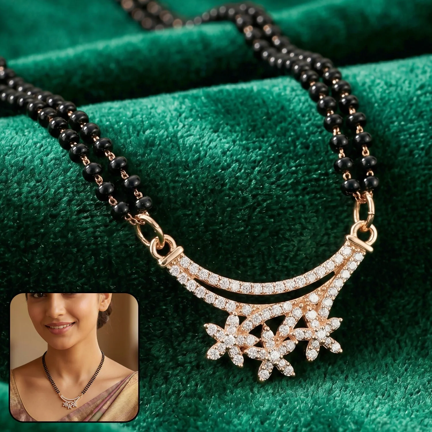 Be the first to review Rose Gold Finish Triple Starburst CZ Cluster Pendant Double Strand Mangalsutra!
