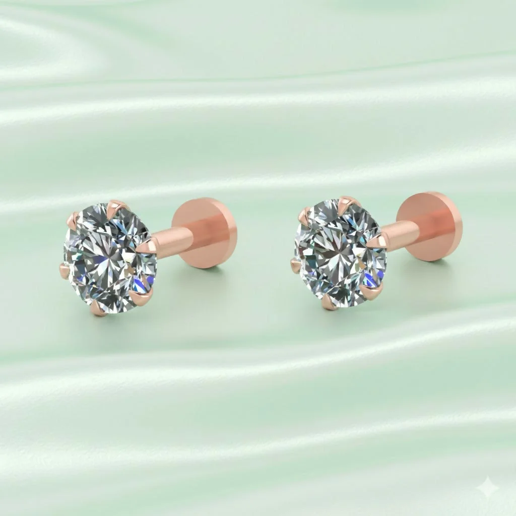 These elegant stud earrings feature a brilliant-cut solitaire stone set in a sophisticated four-prong rose gold setting. Designed with a flat back (labret style), they are engineered for 24/7 wear—perfect for those who want to sleep, shower, and live in their jewelry without the poke of a traditional earring post.