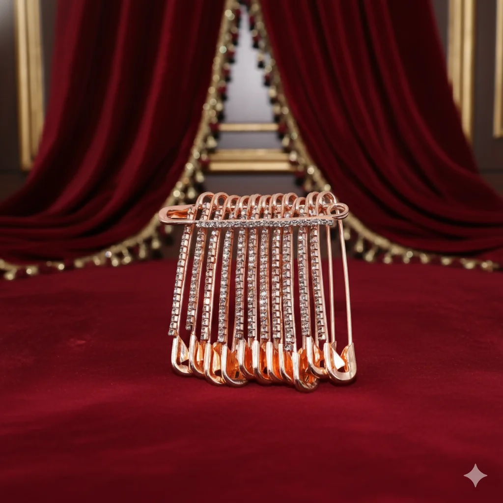 Premium Design: Features ten individual safety pins in a brilliant rose gold finish, securely attached to a main pin bar.