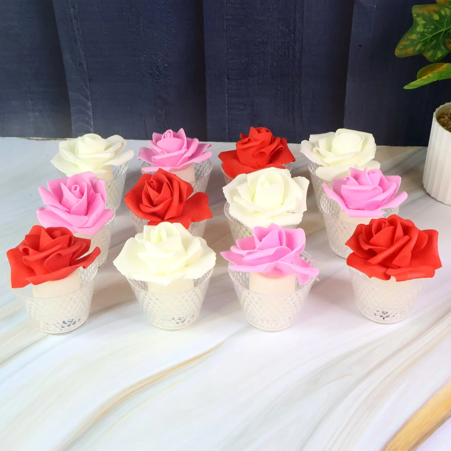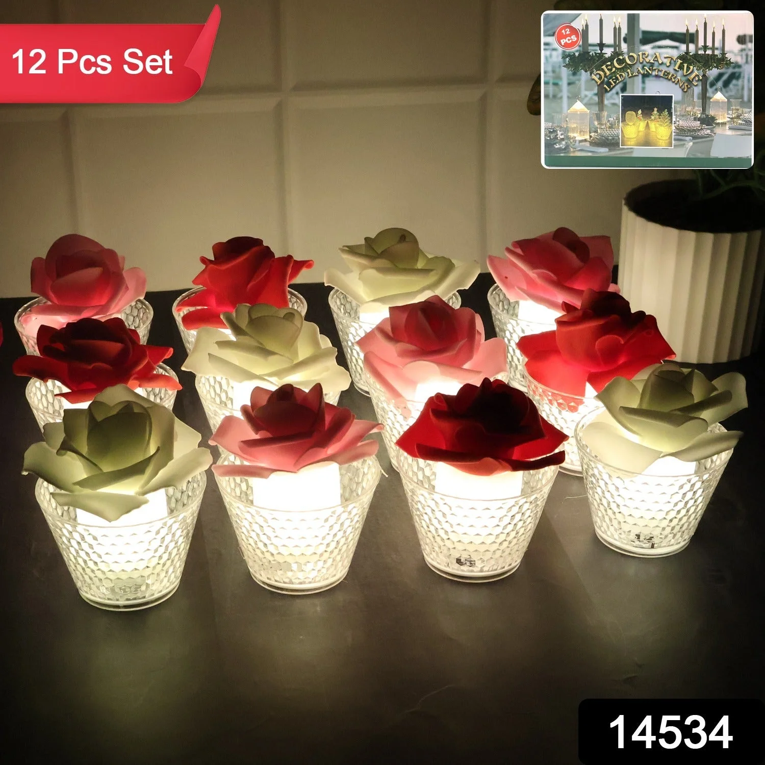 Add elegance and charm to your décor with this Set of 12 Rose Shaped Flameless LED Candles. Each candle is designed with a beautifully crafted artificial rose flower on top, placed inside a textured glass holder that glows softly when lit. These flameless LED candles replicate the warm flicker of real candlelight, creating a romantic and inviting atmosphere without the risks of fire, smoke, or dripping wax. Perfect for festivals, weddings, parties, and daily home décor, these rose candles bring beauty, sophistication, and safety together. Reusable and durable, they are ideal for creating a luxurious ambience in any space.
