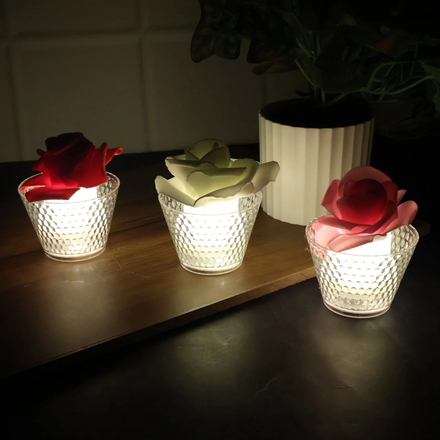 Set of 12 Rose Shaped Decorative Flameless LED Candles with Glass Holder – Romantic Warm Glow Tea Light for Home Décor, Festivals, Weddings, Parties, and Special Events