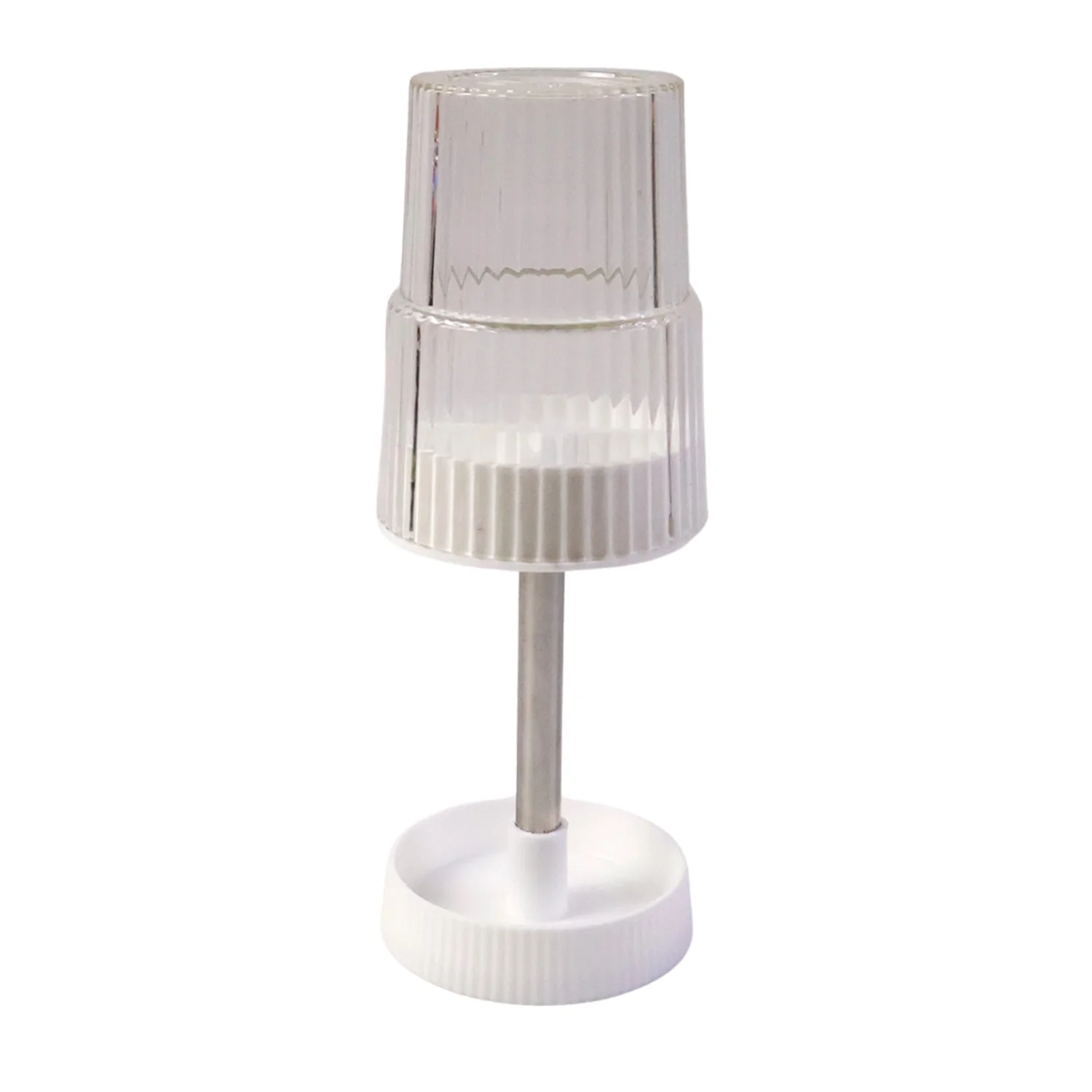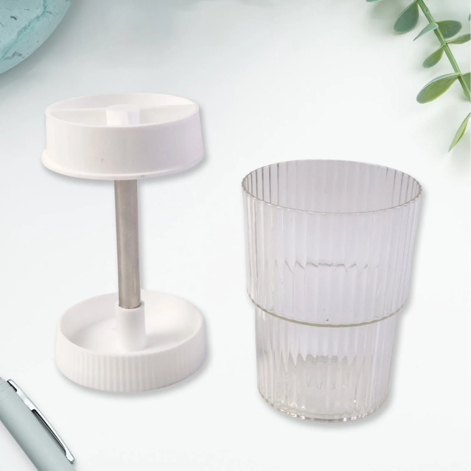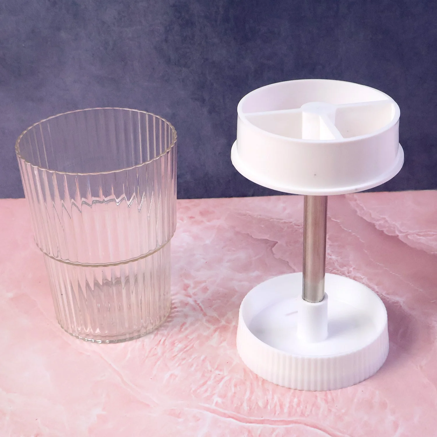 Design: Vertical stand with divided rotating tray and separate ribbed tumbler