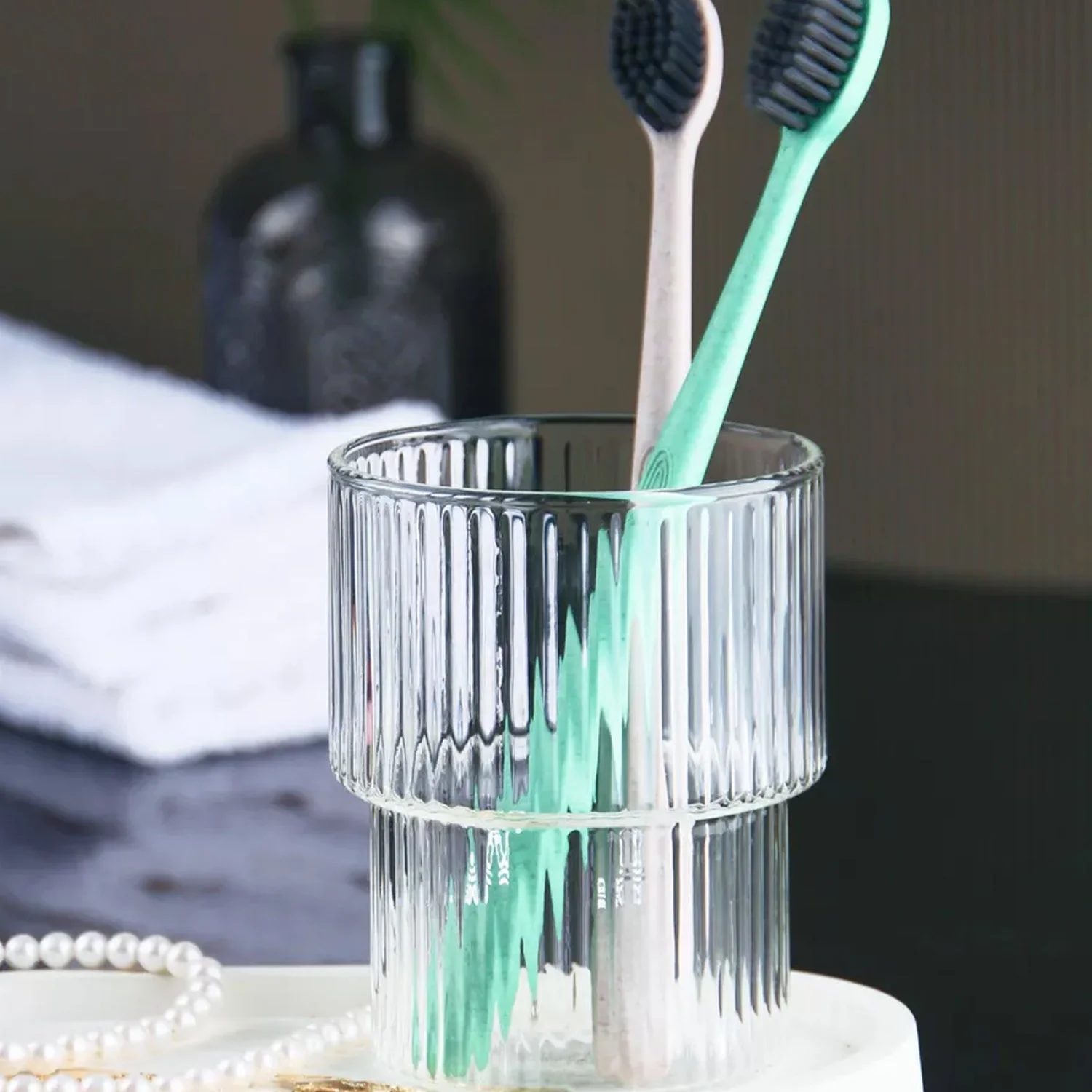 Matching ribbed tumbler for rinsing or additional storage of brushes and accessories