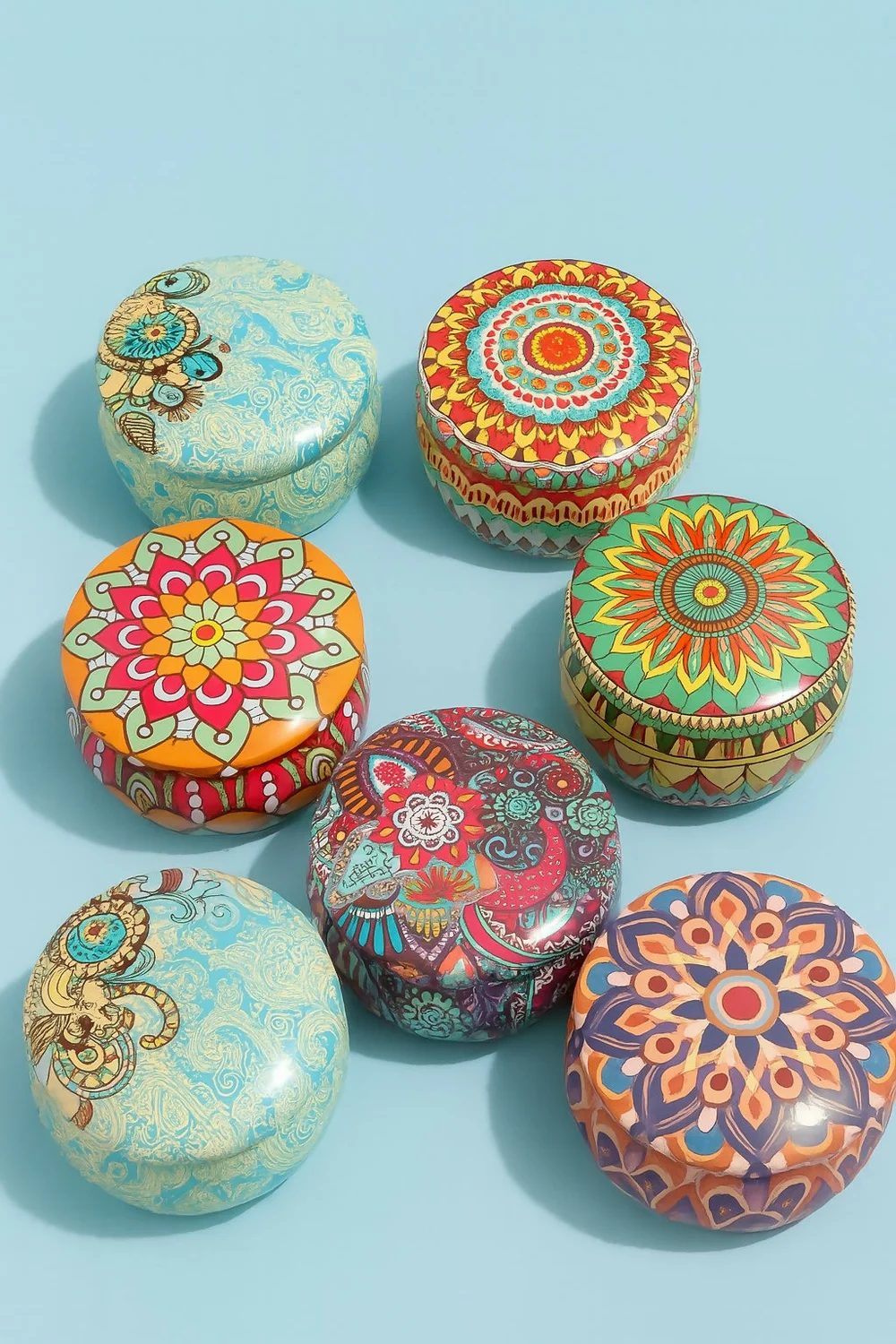Set of 6 Pieces: Includes six round metal tins with unique and colorful bohemian/mandala designs.