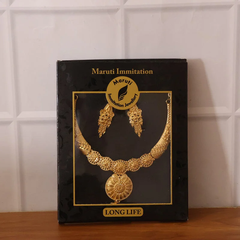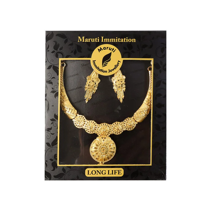 This elegant choker necklace set features a beautifully crafted row of circular engraved elements leading to a stunning round centerpiece, giving it a bold, artistic, and traditional appeal. The curved choker design sits gracefully on the neckline, highlighting the intricate detailing that adds richness and character. Paired with matching statement earrings, the set offers a complete ethnic look perfect for weddings, festive occasions, and cultural celebrations. Its refined craftsmanship, eye-catching design, and premium finish make it a standout choice for women who love jewellery that blends heritage style with modern elegance.