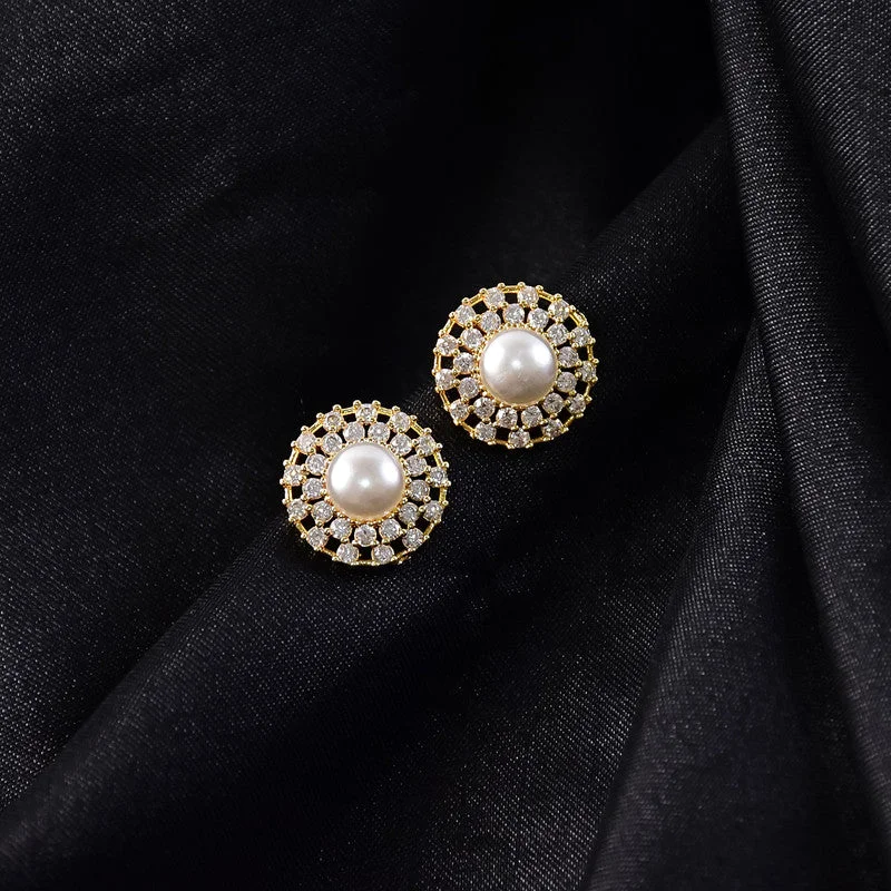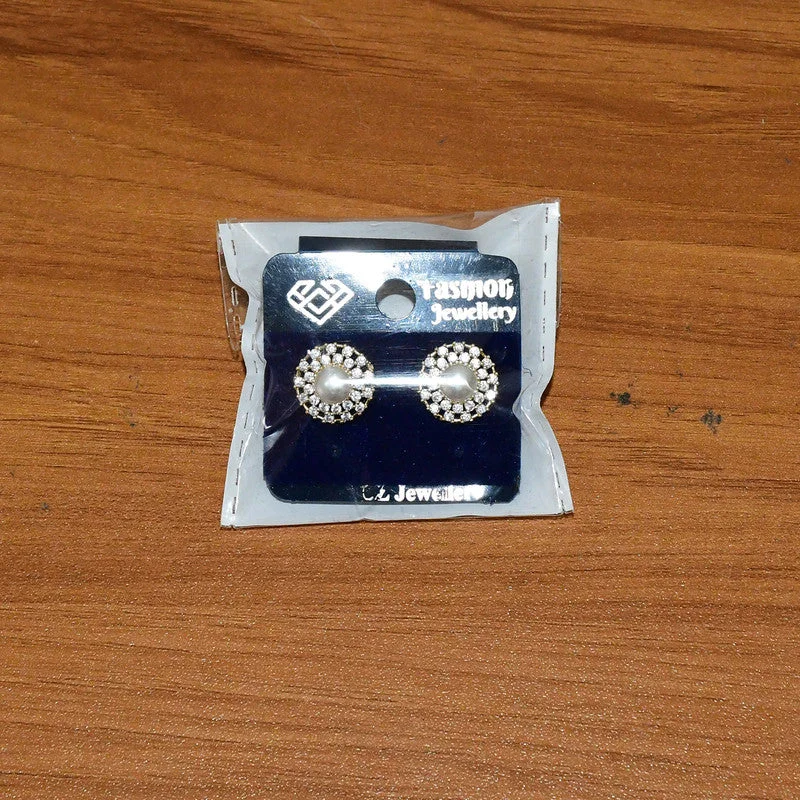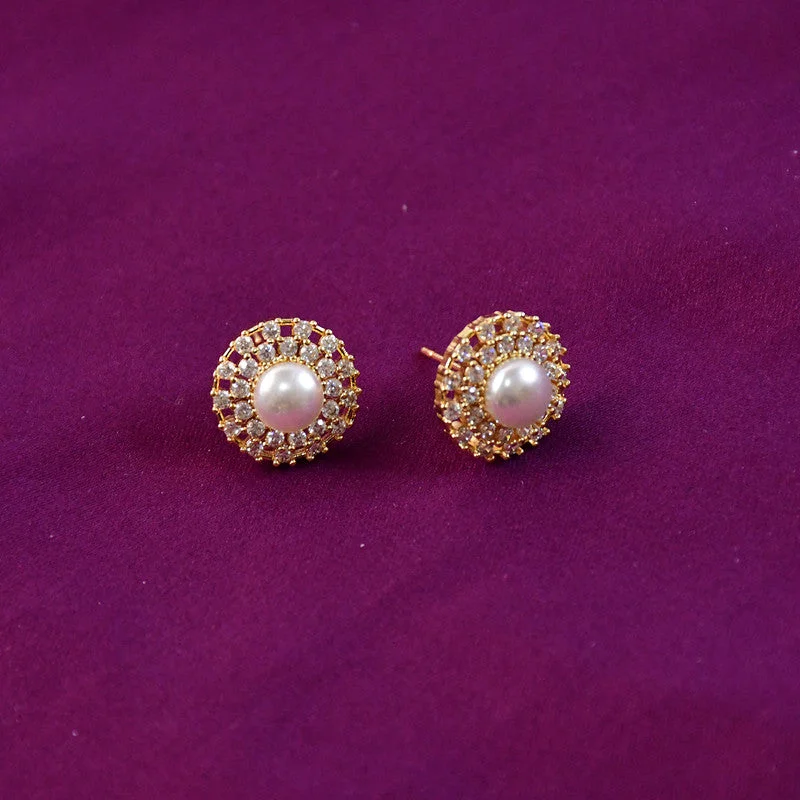 Be the first to review Round Pearl Stud Earrings with Crystal Border and Gold Finish for Women!